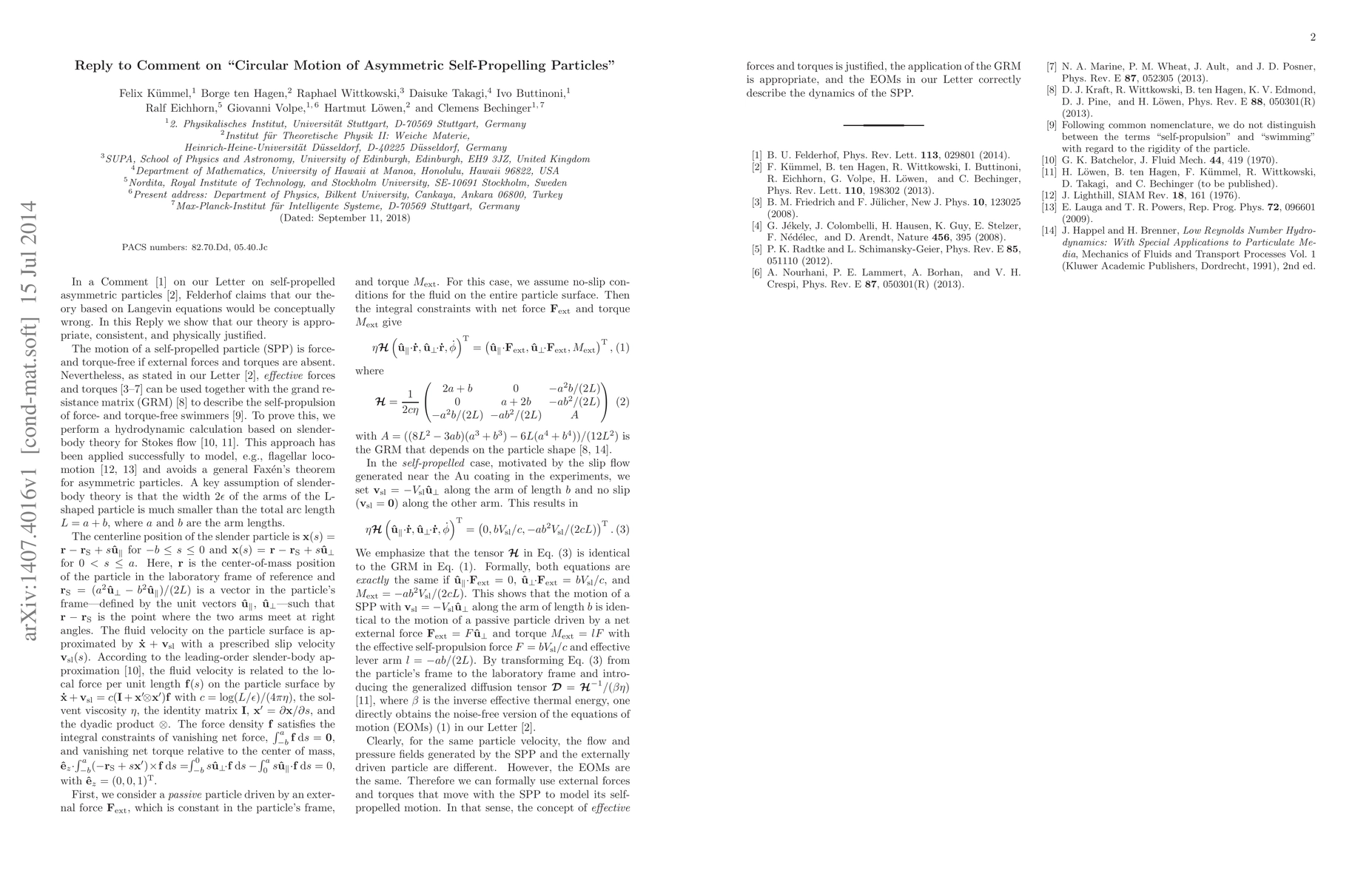 In a Comment [Phys. Rev. Lett. 113, 029801 (2014)] on our Letter on self-propelled asymmetric particles [Phys. Rev. Lett. 110, 198302 (2013); arXiv:1302.5787], Felderhof claims that our theory based on Langevin equations would be conceptually wrong. In this Reply we show that our theory is appropriate, consistent, and physically justified.