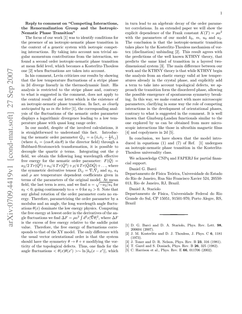 The focus of our work is to identify conditions for the presence of an isotropic-nematic phase transition in the context of a generic system with isotropic competing interactions. The comment 0709.4205 criticizes our results by showing that the low temperature fluctuations of a stripe phase in 2d diverge linearly in the thermodynamic limit. The analysis is restricted to the stripe phase and does not apply to the central result of our letter. We show, contrary to what is suggested in the comment, that the model introduced by D. G. Barci and D. A. Stariolo in PRL98, 200604 (2007) undergoes an isotropic-nematic phase transition in the Kosterlitz-Thouless universality class.