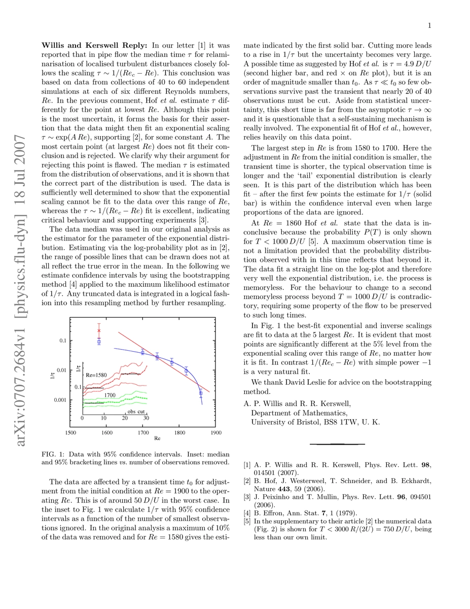 This is a Reply to Comment arXiv:0707.2642 by Hof et al. on Letter arXiv:physics/0608292 which was subsequently published in Phys Rev Lett, 98, 014501 (2007). In our letter it was reported that in pipe flow the median time $\tau$ for relaminarisation of localised turbulent disturbances closely follows the scaling $\tau\sim 1/(Re_c-Re)$. This conclusion was based on data from collections of 40 to 60 independent simulations at each of six different Reynolds numbers, Re. In the Comment, Hof et al. estimate $\tau$ differently for the point at lowest Re. Although this point is the most uncertain, it forms the basis for their assertion that the data might then fit an exponential scaling $\tau\sim \exp(A Re)$, for some constant A, supporting Hof et al. (2006) Nature, 443, 59. The most certain point (at largest Re) does not fit their conclusion and is rejected. We clarify why their argument for rejecting this point is flawed. The median $\tau$ is estimated from the distribution of observations, and it is shown that the correct part of the distribution is used. The data is sufficiently well determined to show that the exponential scaling cannot be fit to the data over this range of Re, whereas the $\tau\sim 1/(Re_c-Re)$ fit is excellent, indicating critical behaviour and supporting experiments by Peixinho & Mullin 2006.