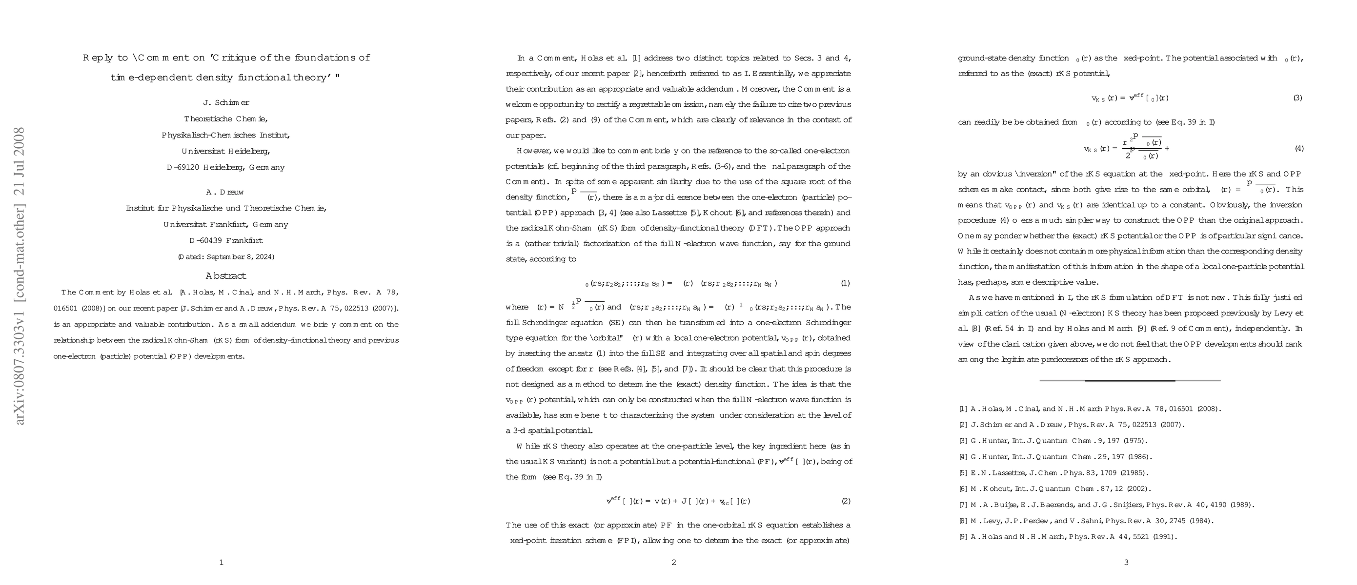 The Comment by Holas et al. [A. Holas, M. Cinal, and N. H. March, Phys. Rev. A 78, 016501 (2008)] on our recent paper [J. Schirmer and A. Dreuw, Phys. Rev. A 75, 022513 (2007)]. is an appropriate and valuable contribution. As a small addendum we briefly comment on the relationship between the radical Kohn-Sham (rKS) form of density-functional theory and previous one-electron (particle) potential (OPP) developments.