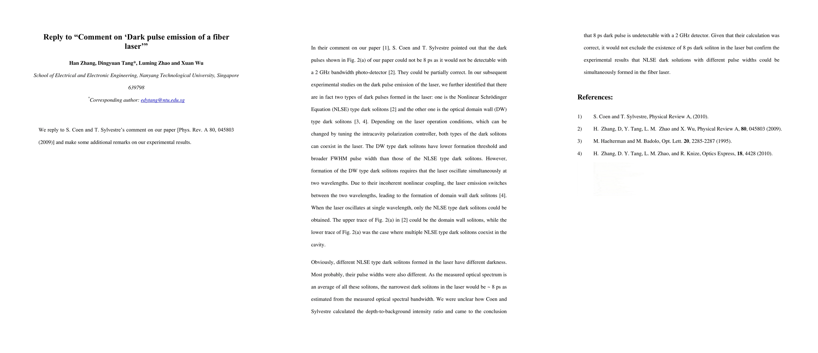 Summary: This paper addresses and responds to comments by S. Coen and T. Sylvestre regarding the authors' previous work on dark pulse emission in fiber lasers, and provides further insights into their experimental findings.