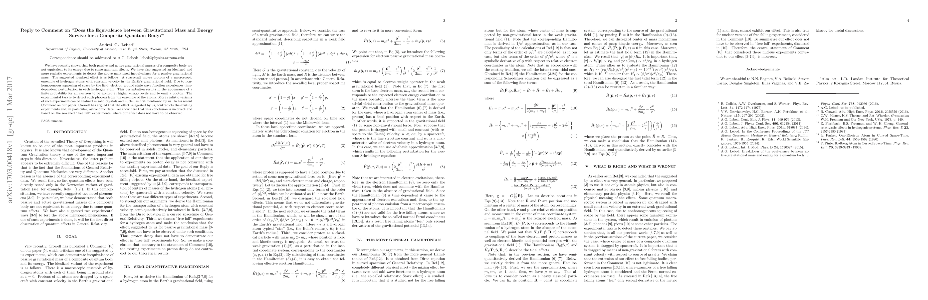 We have recently shown that both passive and active gravitational masses of a composite body are not equivalent to its energy due to some quantum effects. We have also suggested an idealized and more realistic experiments to detect the above mentioned inequivalence for a passive gravitational mass. The suggested idealized effect is as follows. A spacecraft moves protons of a macroscopic ensemble of hydrogen atoms with constant velocity in the Earth's gravitational field. Due to non-homogeneous squeezing of space by the field, electron ground state wave function experiences time-dependent perturbation in each hydrogen atom. This perturbation results in the appearance of a finite probability for an electron to be excited at higher energy levels and to emit a photon. The experimental task is to detect such photons from the ensemble of the atoms. More realistic variants of such experiment can be realized in solid crystals and nuclei, as first mentioned by us. In his recent Comment on our paper, Crowell has argued that the effect, suggested by us, contradicts the existing experiments and, in particular, astronomic data. We show here that this conclusion is incorrect and based on the so-called "free fall" experiments, where our effect does not have to be observed.