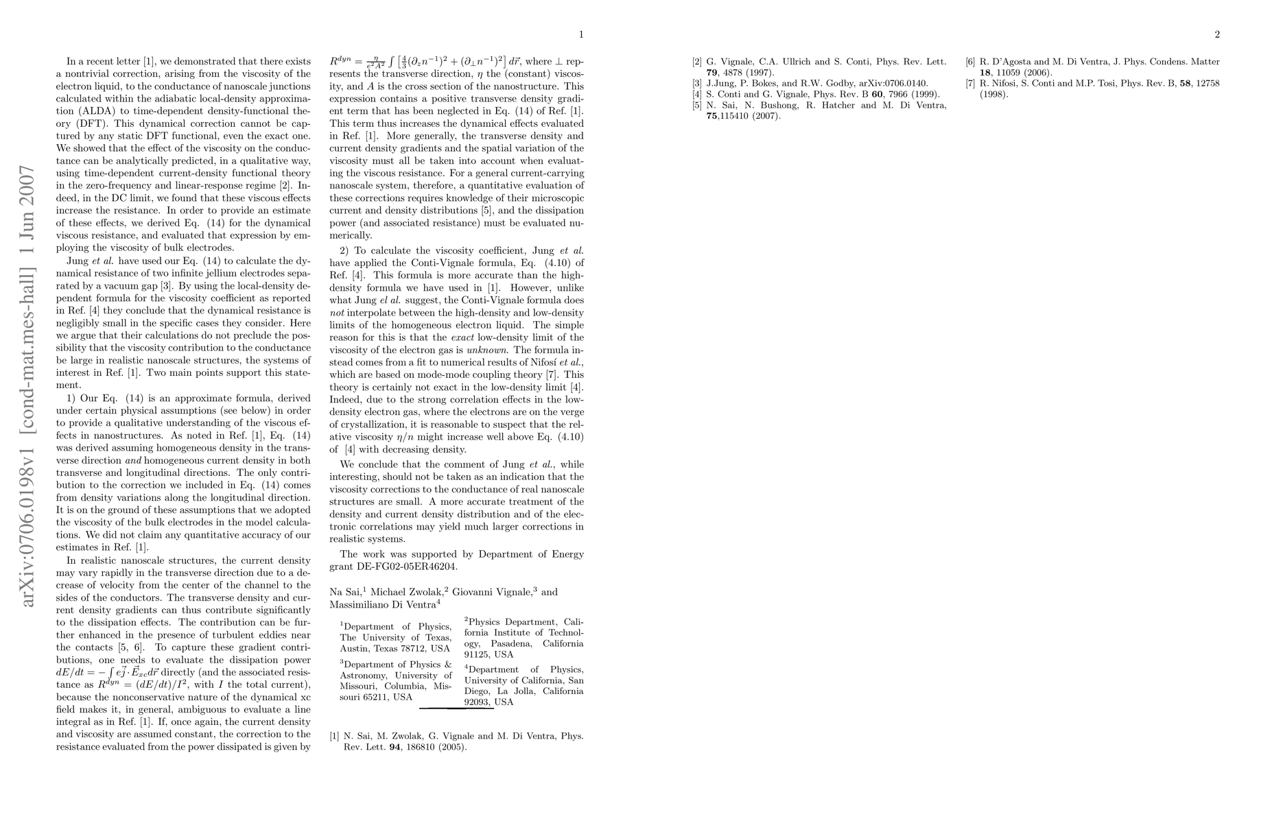 We reply to the comment by Jung, Bokes, and Godby (arXiv:0706.0140) on our paper Phys. Rev. Lett. 94, 186810 (2005). We show that the results in their comment should not be taken as an indication that the viscosity corrections to the conductance of real nanoscale structures are small. A more accurate treatment of the density and current density distribution and of the electronic correlations may yield much larger corrections in realistic systems.