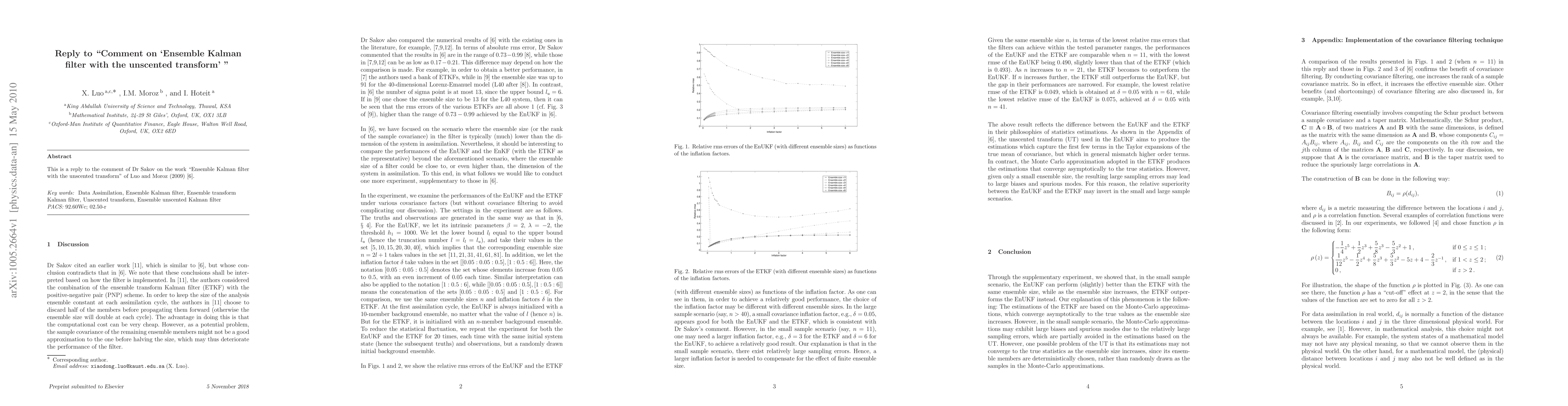 This paper addresses and clarifies points raised by Dr. Sakov regarding the "Ensemble Kalman filter with the unscented transform" methodology developed by Luo and Moroz in 2009, aiming to provide a more precise understanding and response to the critique.