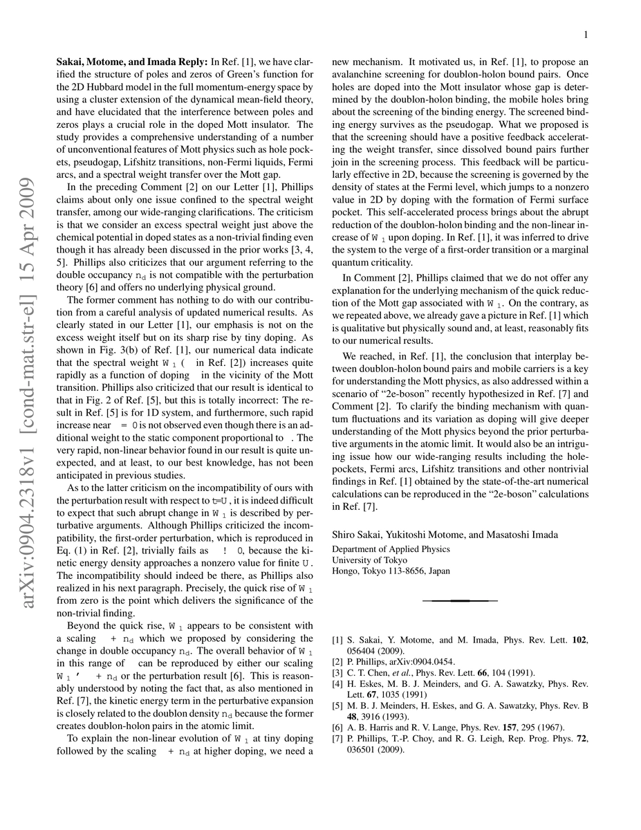 In a recent Comment [arXiv:0904.0454] on our Letter [Phys. Rev. Lett. 102, 056404 (2009); arXiv:0809:0950], Phillips criticizes one specific issue discussed in our paper, concerning the spectral weight transfer, among our wide-ranging clarifications of the filling-control Mott transition. Here we show that all his criticisms have nothing to do with our contributions. Our nontrivial finding on this particular aspect is a very quick, non-linear increase in the spectral weight just above the chemical potential caused by tiny doping to the Mott insulator, which is indeed unprecedented in the literature. We call attention to its novelty in comparison with the perturbation theory, and reemphasize our picture for the quick weight transfer, that is, an avalanchine screening of doublon-holon binding energy.
