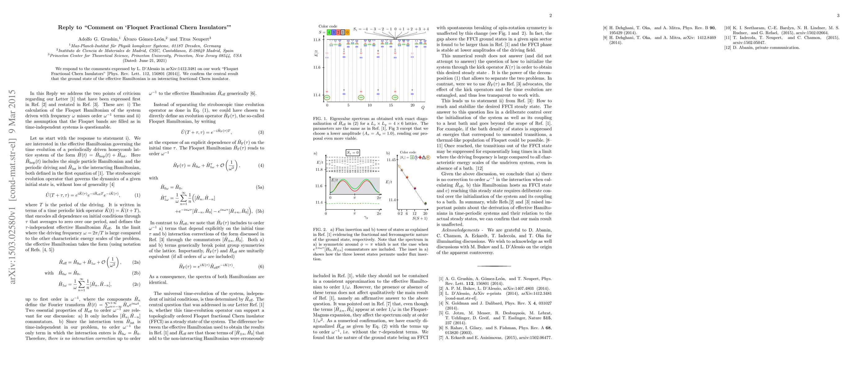 We respond to the comments expressed by L. D'Alessio in arXiv:1412.3481 on our work "Floquet Fractional Chern Insulators" [Phys. Rev. Lett. 112, 156801 (2014)]. We confirm the central result that the ground state of the effective Hamiltonian is an interacting fractional Chern insulator.