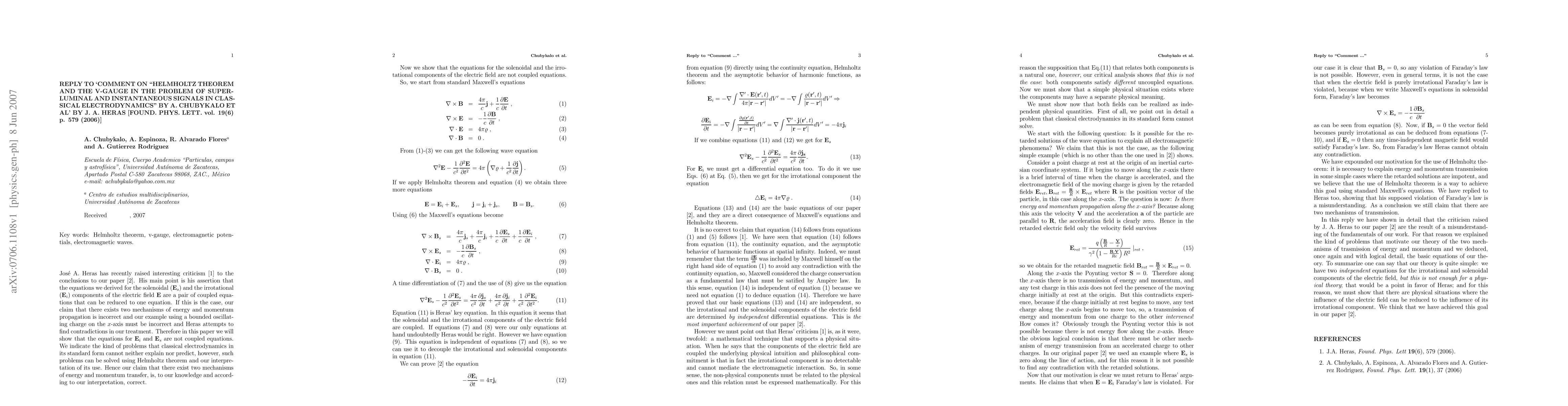 This is the reply to `COMMENT ON ``HELMHOLTZ THEOREM AND THE V-GAUGE IN THE PROBLEM OF SUPERLUMINAL AND INSTANTANEOUS SIGNALS IN CLASSICAL ELECTRODYNAMICS" BY A. CHUBYKALO ET AL' BY J. A. HERAS [FOUND. PHYS. LETT. vol. 19(6) p. 579 (2006)]