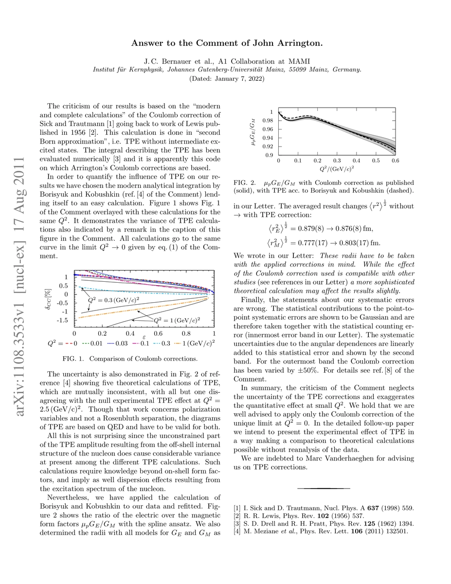 In arXiv:1108.3058v1 [nucl-ex], Arrington criticizes the Coulomb corrections we applied in the analysis of high precision form factor data (see Phys.Rev.Lett.105:242001, 2010, arXiv:1007.5076v3 [nucl-ex]). We show, by comparing different calculations cited in the Comment, that the criticism of the Comment neglects the large uncertainty of "more modern" TPE corrections. This uncertainty has also been seen in recent polarized measurements. We rerun our analysis using one of these calculations. The results show that the Comment exaggerates the quantitative effect at small Q^2.