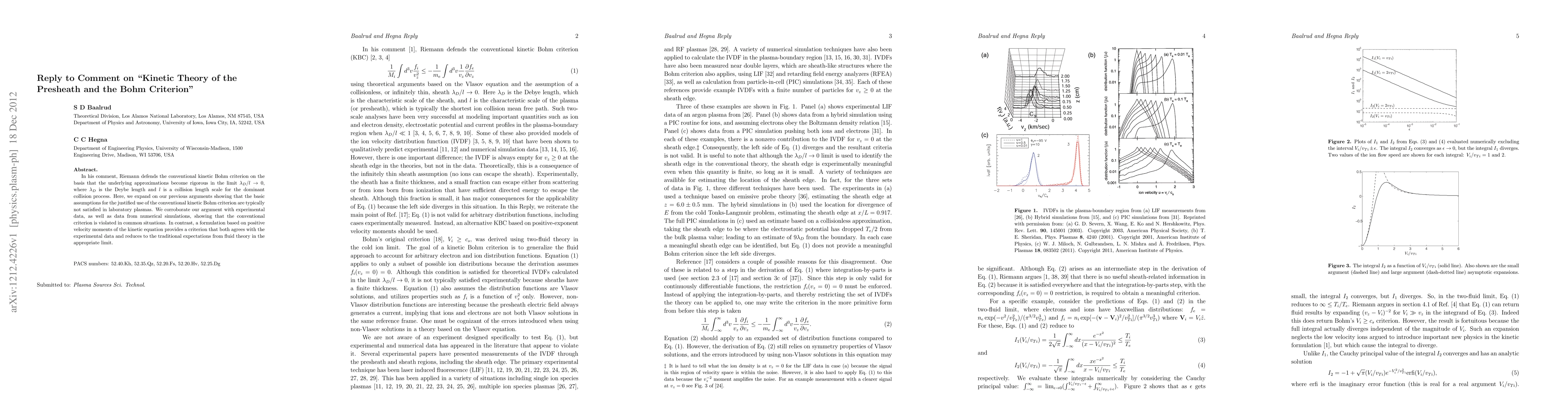 In his comment, Riemann defends the conventional kinetic Bohm criterion on the basis that the underlying approximations become rigorous in the limit \lambda_D/l \rightarrow 0, where \lambda_D is the Deybe length and l is a collision length scale for the dominant collision process. Here, we expand on our previous arguments showing that the basic assumptions for the justified use of the conventional kinetic Bohm criterion are typically not satisfied in laboratory plasmas. We corroborate our argument with experimental data, as well as data from numerical simulations, showing that the conventional criterion is violated in common situations. In contrast, a formulation based on positive velocity moments of the kinetic equation provides a criterion that both agrees with the experimental data and reduces to the traditional expectations from fluid theory in the appropriate limit.