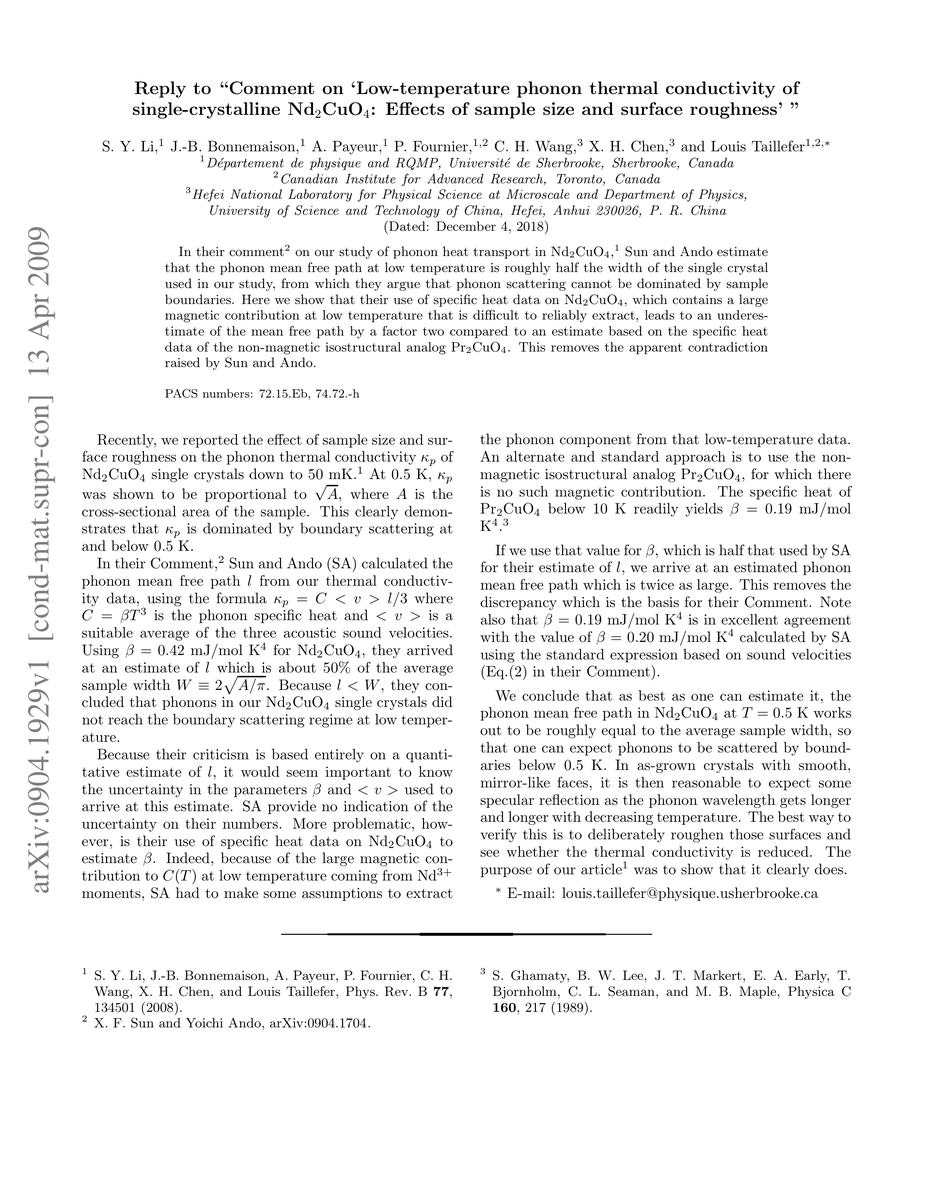 In their comment \cite{Sun} on our study of phonon heat transport in Nd$_2$CuO$_4$ \cite{Li}, Sun and Ando estimate that the phonon mean free path at low temperature is roughly half the width of the single crystal used in our study, from which they argue that phonon scattering cannot be dominated by sample boundaries. Here we show that their use of specific heat data on Nd$_2$CuO$_4$, which contains a large magnetic contribution at low temperature that is difficult to reliably extract, leads to an underestimate of the mean free path by a factor two compared to an estimate based on the specific heat data of the non-magnetic isostructural analog Pr$_2$CuO$_4$. This removes the apparent contradiction raised by Sun and Ando.