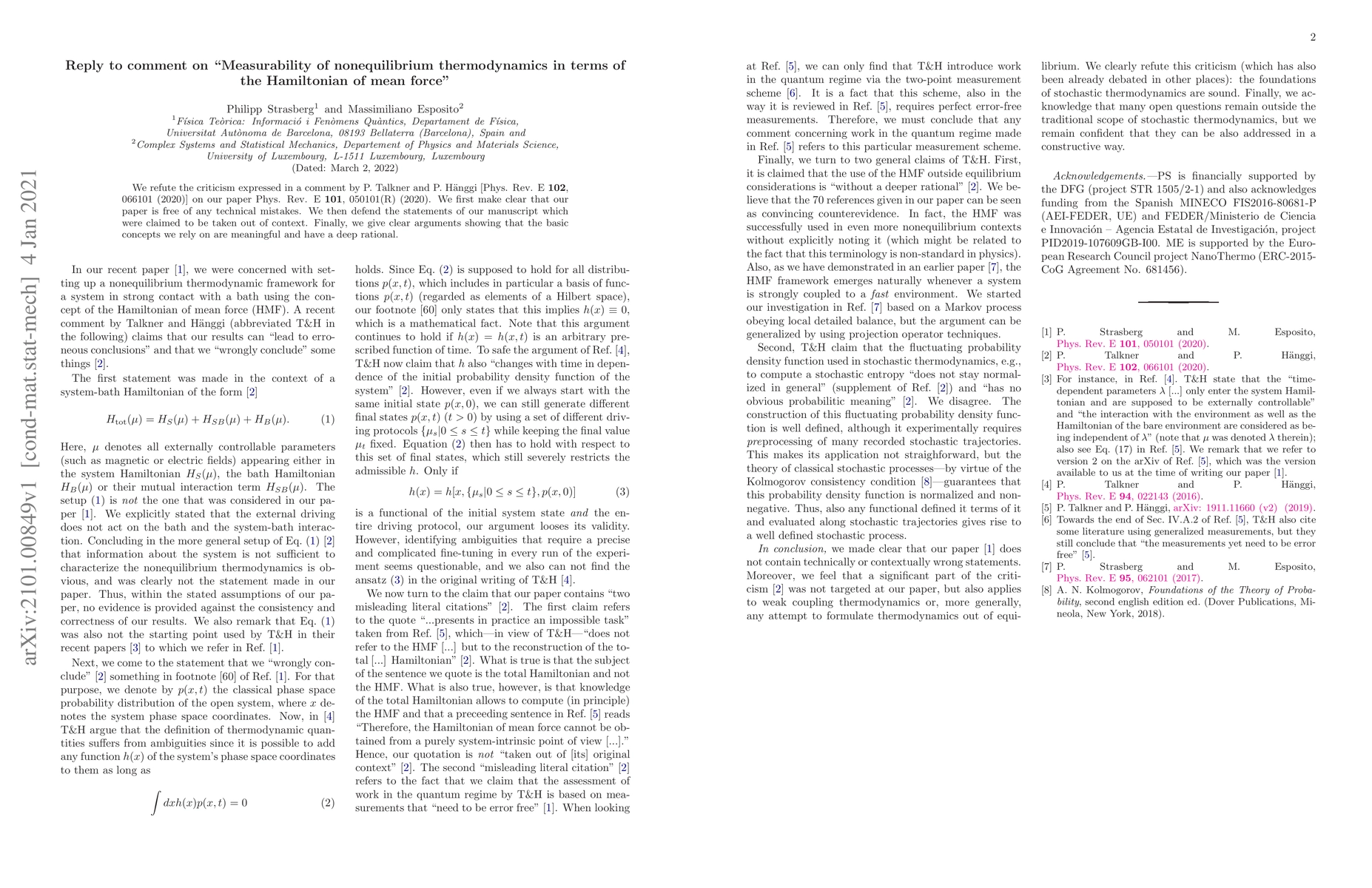 We refute the criticism expressed in a comment by P. Talkner and P. H\"anggi [Phys. Rev. E 102, 066101 (2020)] on our paper Phys. Rev. E 101, 050101(R) (2020). We first make clear that our paper is free of any technical mistakes. We then defend the statements of our manuscript which were claimed to be taken out of context. Finally, we give clear arguments showing that the basic concepts we rely on are meaningful and have a deep rational.