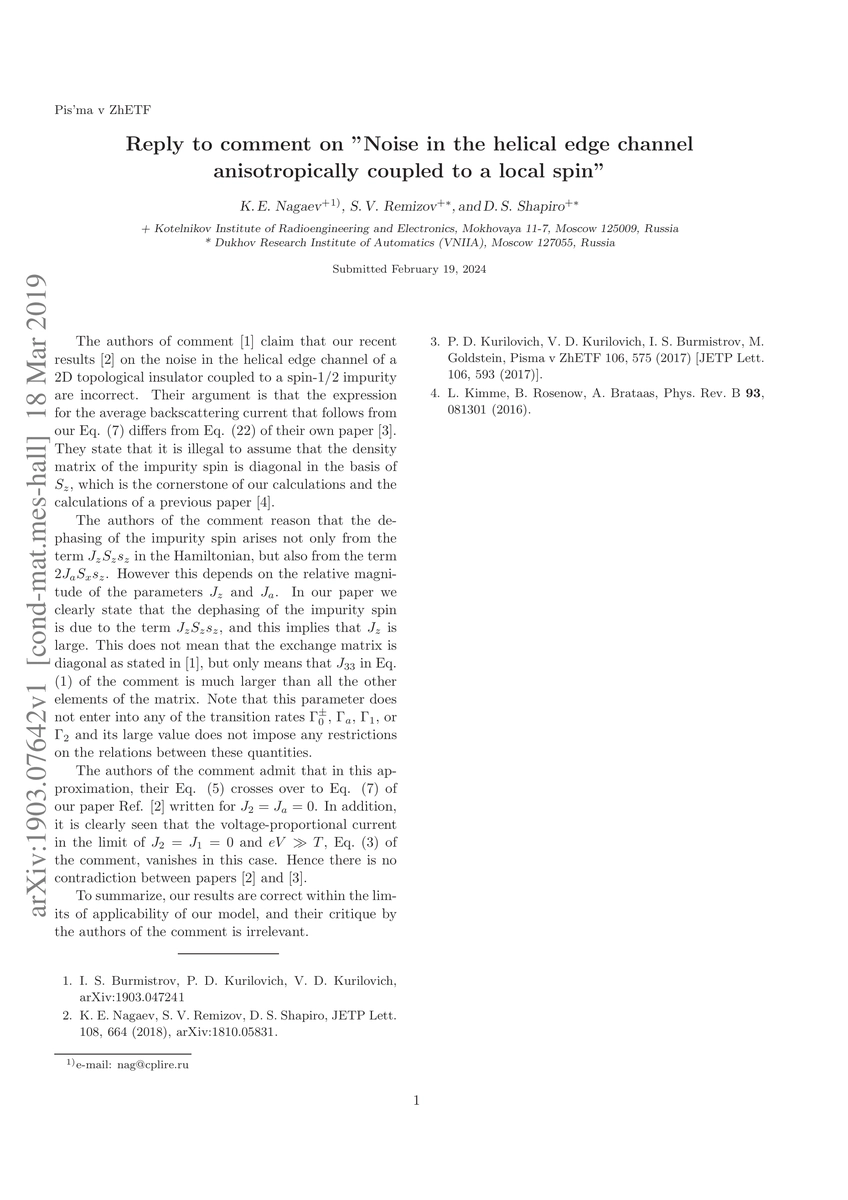 This is the reply to the comment by I. S. Burmistrov, P. D. Kurilovich, and V. D. Kurilovich [arXiv:1903.047241] on our paper "Noise in the helical edge channel anisotropically coupled to a local spin" [JETP Lett. 108, 664 (2018), arXiv:1810.05831].