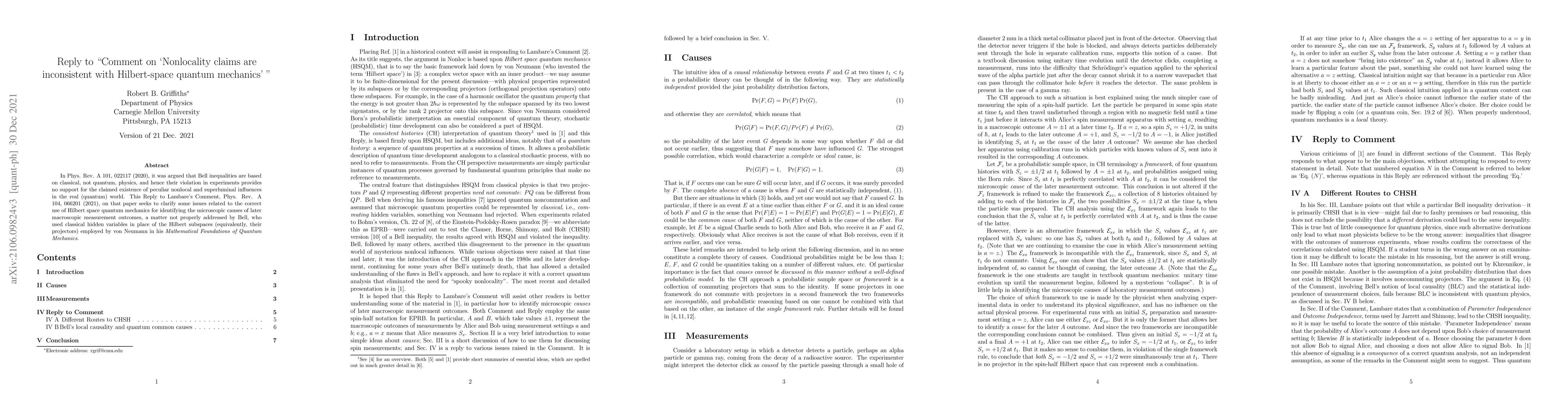 In Phys. Rev. A 101, 022117 (2020), it was argued that Bell inequalities are based on classical, not quantum, physics, and hence their violation in experiments provides no support for the claimed existence of peculiar nonlocal and superluminal influences in the real (quantum) world. This Reply to Lambare's Comment, Phys. Rev. A 104, 066201 (2021), on that paper seeks to clarify some issues related to the correct use of Hilbert space quantum mechanics for identifying the microscopic causes of later macroscopic measurement outcomes, a matter not properly addressed by Bell, who used classical hidden variables in place of the Hilbert subspaces (equivalently, their projectors) employed by von Neumann in his \it{Mathematical Foundations of Quantum Mechanics}.