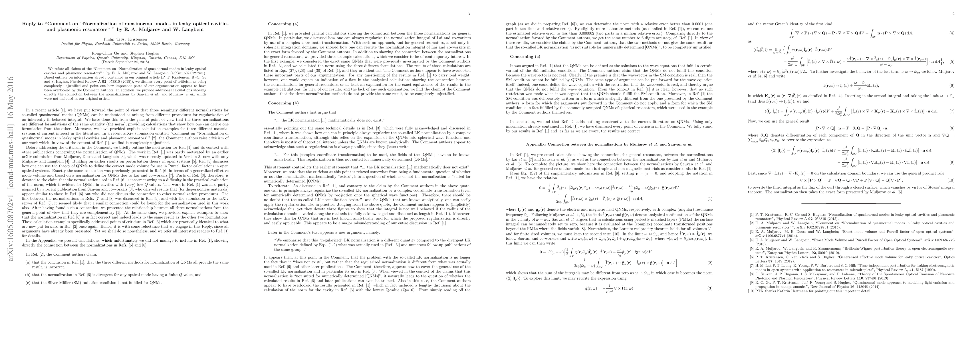 This paper refutes claims made in a previous comment regarding the normalization of quasinormal modes in optical cavities and plasmonic resonators. The authors assert that all criticisms are unfounded and based on overlooked details from their original work, while also presenting new calculations that clarify the connection between different normalization methods.