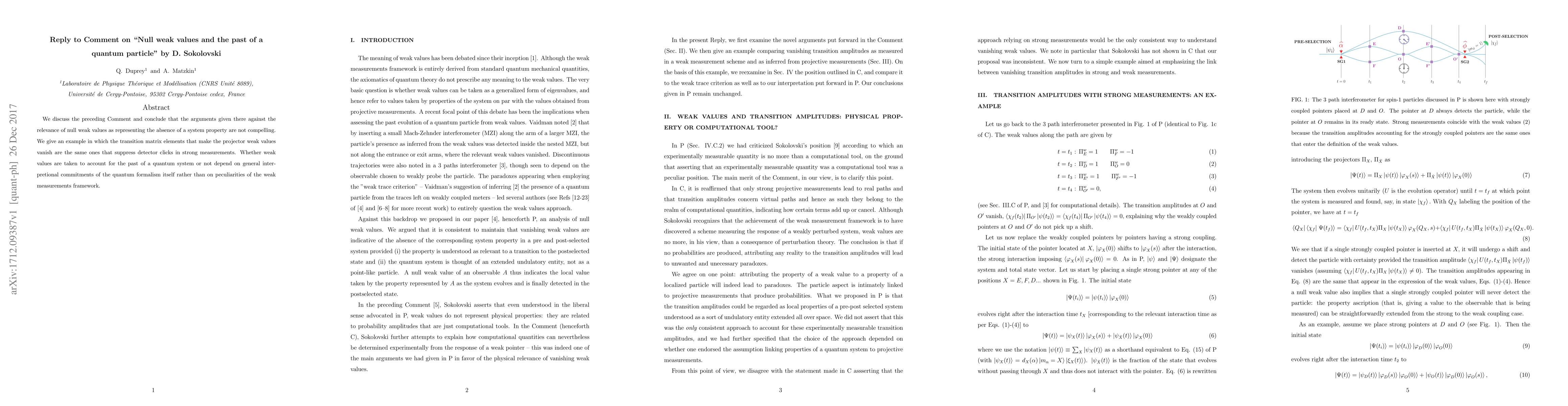 We discuss the preceding Comment and conclude that the arguments given there against the relevance of null weak values as representing the absence of a system property are not compelling. We give an example in which the transition matrix elements that make the projector weak values vanish are the same ones that suppress detector clicks in strong measurements. Whether weak values are taken to account for the past of a quantum system or not depend on general interpretional commitments of the quantum formalism itself rather than on peculiarities of the weak measurements framework.