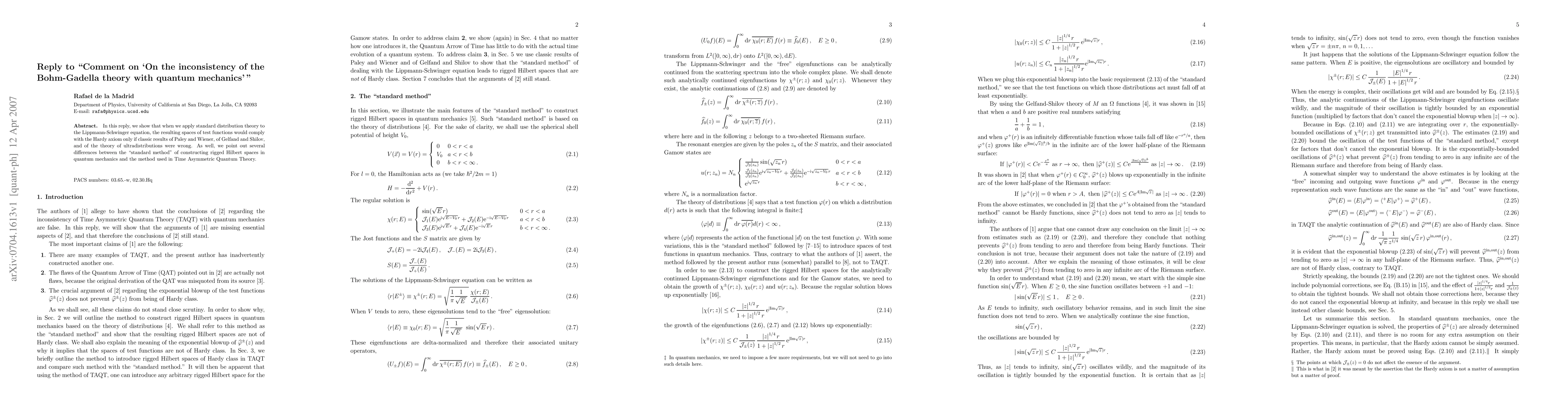 In this reply, we show that when we apply standard distribution theory to the Lippmann-Schwinger equation, the resulting spaces of test functions would comply with the Hardy axiom only if classic results of Paley and Wiener, of Gelfand and Shilov, and of the theory of ultradistributions were wrong. As well, we point out several differences between the ``standard method'' of constructing rigged Hilbert spaces in quantum mechanics and the method used in Time Asymmetric Quantum Theory.