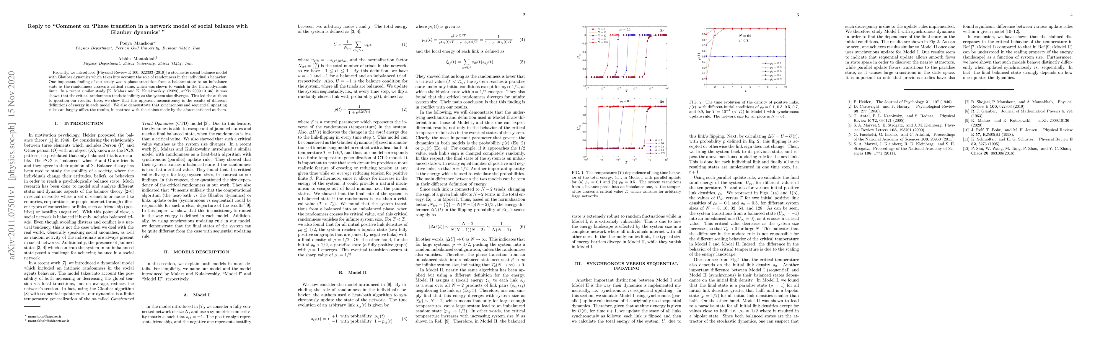 Recently, we introduced [Physical Review E 100, 022303 (2019)] a stochastic social balance model with Glauber dynamics which takes into account the role of randomness in the individual's behavior. One important finding of our study was a phase transition from a balance state to an imbalance state as the randomness crosses a critical value, which was shown to vanish in the thermodynamic limit. In a recent similar study [K. Malarz and K. Ku\l akowskiy, (2020), arXiv:2009.10136], it was shown that the critical randomness tends to infinity as the system size diverges. This led the authors to question our results. Here, we show that this apparent inconsistency is the results of different definitions of energy in each model. We also demonstrate that synchronous and sequential updating rules can largely affect the results, in contrast with the claims made by the aforementioned authors.