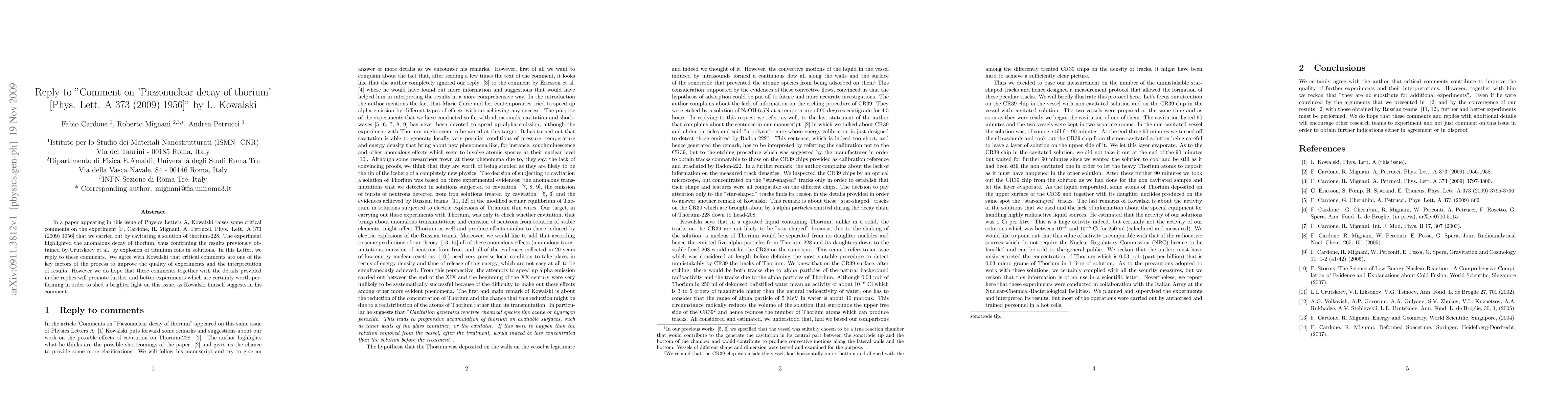 In a paper appearing in this issue of Physics Letters A, Kowalski raises some critical comments on the experiment [F. Cardone, R. Mignani, A. Petrucci, Phys. Lett. A 373 (2009) 1956] that we carried out by cavitating a solution of thorium-228. The experiment highlighted the anomalous decay of thorium, thus confirming the results previously obtained by Urutskoev et al. by explosion of titanium foils in solutions. In this Letter, we reply to these comments. We agree with Kowalski that critical comments are one of the key factors of the process to improve the quality of experiments and the interpretation of results. However we do hope that these comments together with the details provided in the replies will promote further and better experiments which are certainly worth performing in order to shed a brighter light on this issue, as Kowalski himself suggests in his comment.