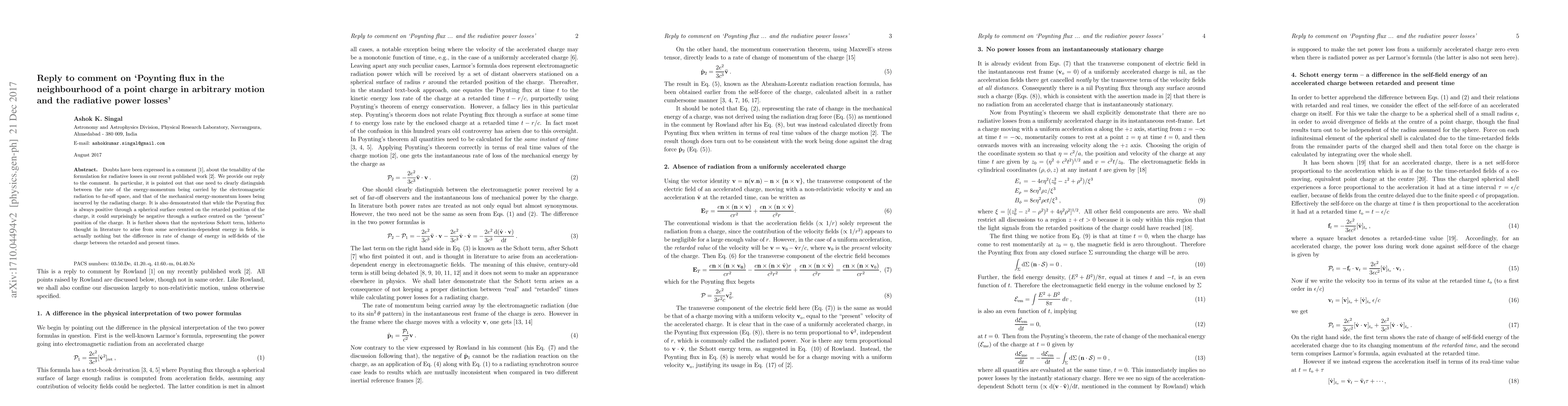 Doubts have been expressed in a comment (Eur. J. Phys., 39, 018001, 2018), about the tenability of the formulation for radiative losses in our recent published work (Eur. J. Phys., 37, 045210, 2016). We provide our reply to the comment. In particular, it is pointed out that one need to clearly distinguish between the rate of the energy-momentum being carried by the electromagnetic radiation to far-off space, and that of the mechanical energy-momentum losses being incurred by the radiating charge. It is also demonstrated that while the Poynting flux is always positive through a spherical surface centred on the retarded position of the charge, it could surprisingly be negative through a surface centred on the "present" position of the charge. It is further shown that the mysterious Schott term, hitherto thought in literature to arise from some acceleration-dependent energy in fields, is actually nothing but the difference in rate of change of energy in self-fields of the charge between the retarded and present times.