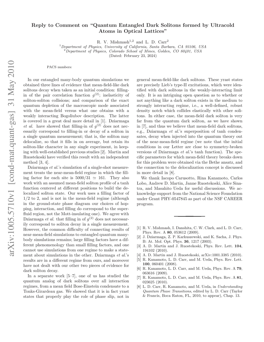 We reply to Jacek Dziarmaga, Piotr Deuar, and Krzysztof Sacha's comment, arXiv:1001.1045, supporting the authors' simulations but differentiating between near-mean-field and strongly quantum regimes. We clarify that we have three lines of evidence on decay of dark solitons and connect our work to Lieb's Type-II excitations and the true meaning of a quantum dark soliton.