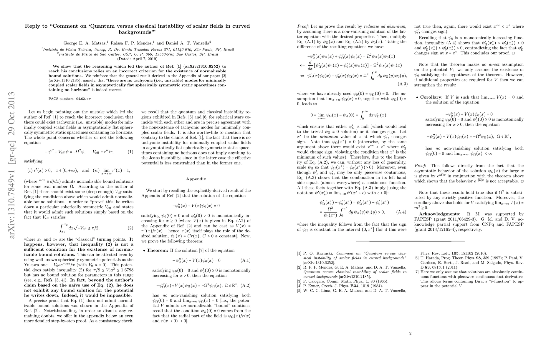 We show that the reasoning which led the author of arXiv:1310.6252 to reach his conclusions relies on an incorrect criterion for the existence of normalizable bound solutions. We reinforce that the general result derived in the Appendix of our paper (arXiv:1310.2185), namely, that "there are no tachyonic (i.e., unstable) modes for minimally coupled scalar fields in asymptotically flat spherically symmetric static spacetimes containing no horizons" is indeed correct.