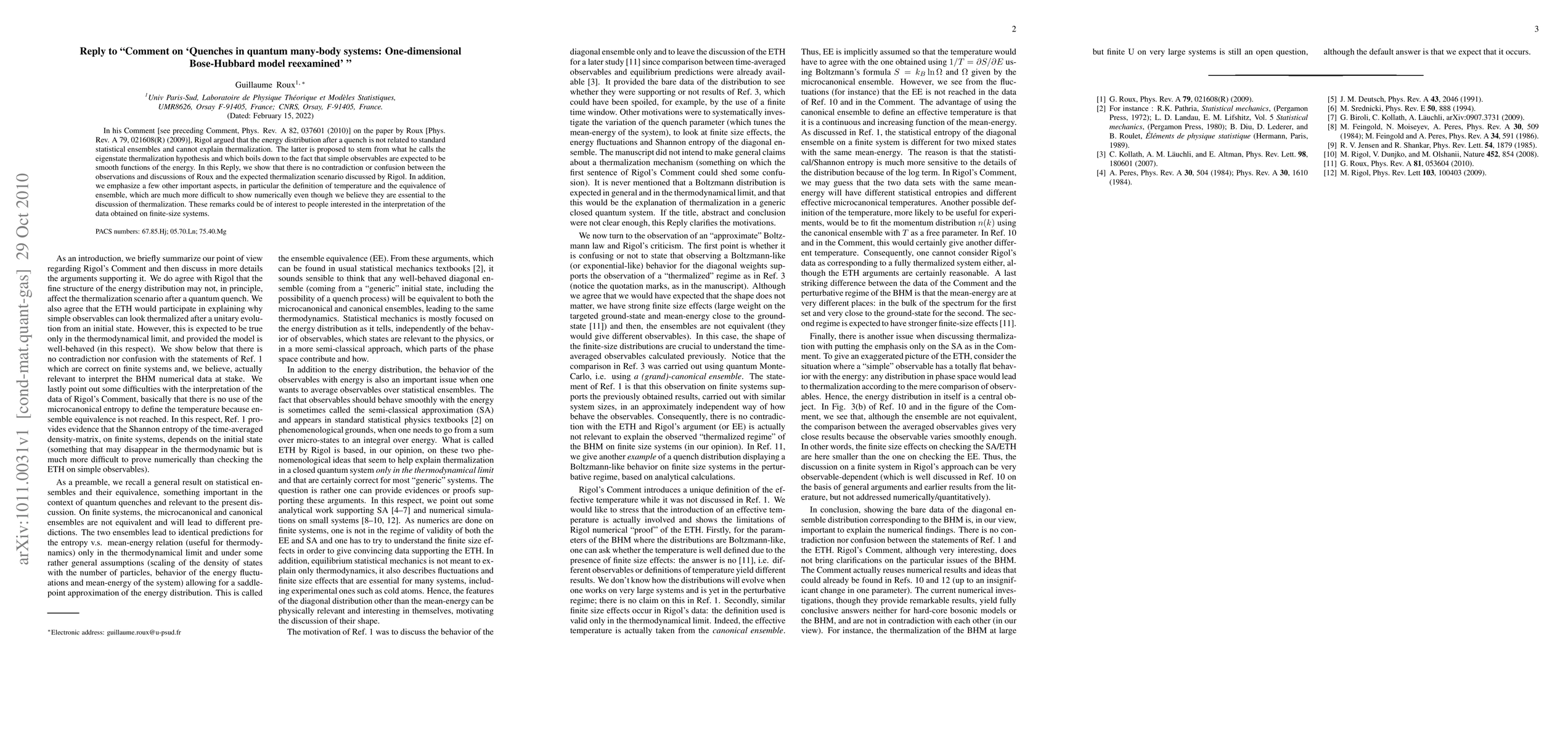 In his Comment [see preceding Comment, Phys. Rev. A 82, 037601 (2010)] on the paper by Roux [Phys. Rev. A 79, 021608(R) (2009)], Rigol argued that the energy distribution after a quench is not related to standard statistical ensembles and cannot explain thermalization. The latter is proposed to stem from what he calls the eigenstate thermalization hypothesis and which boils down to the fact that simple observables are expected to be smooth functions of the energy. In this Reply, we show that there is no contradiction or confusion between the observations and discussions of Roux and the expected thermalization scenario discussed by Rigol. In addition, we emphasize a few other important aspects, in particular the definition of temperature and the equivalence of ensemble, which are much more difficult to show numerically even though we believe they are essential to the discussion of thermalization. These remarks could be of interest to people interested in the interpretation of the data obtained on finite-size systems.