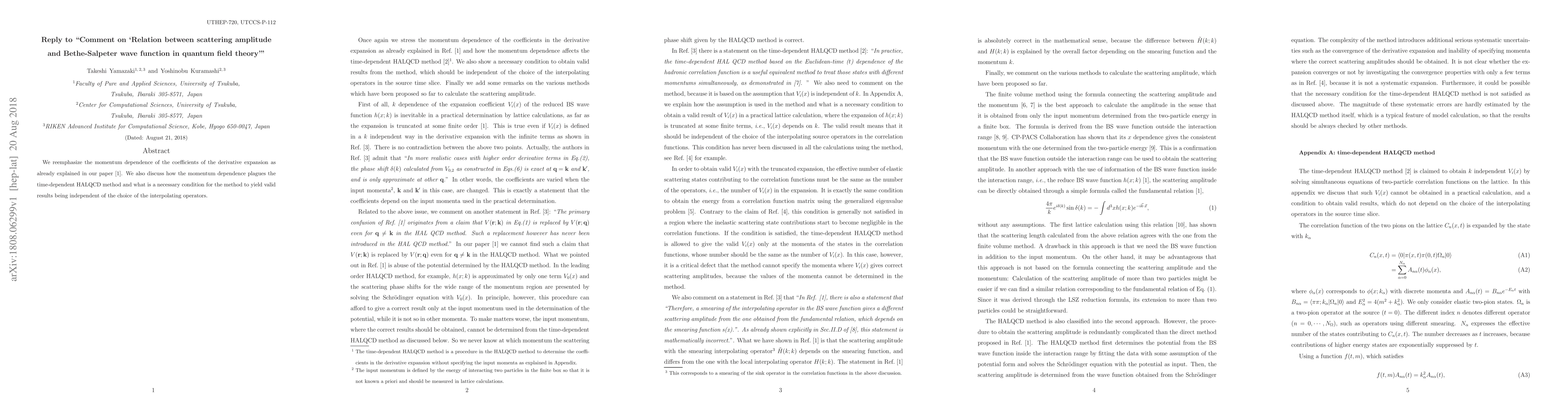 We reemphasize the momentum dependence of the coefficients of the derivative expansion as already explained in our paper [1]. We also discuss how the momentum dependence plagues the time-dependent HALQCD method and what is a necessary condition for the method to yield valid results being independent of the choice of the interpolating operators.