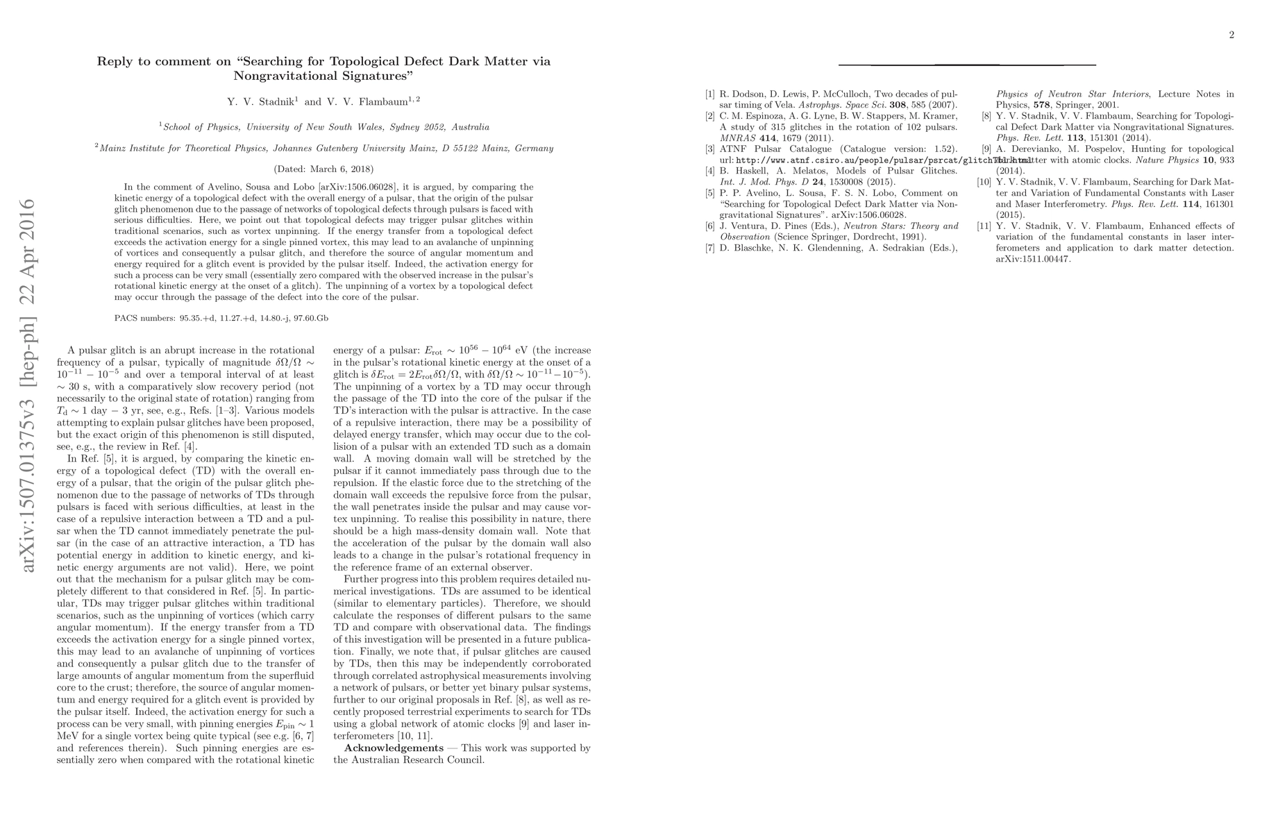 The paper responds to a comment, asserting that topological defects can still trigger pulsar glitches via vortex unpinning, with energy provided by the pulsar itself. This process could occur when a defect passes through the pulsar's core, potentially overcoming the activation energy required for unpinning.