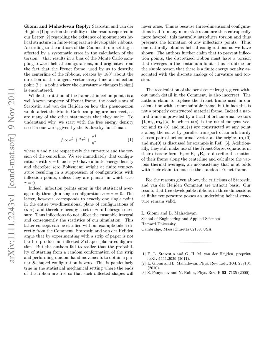 Starostin and van der Heijden [arXiv:1111.2029] question the validity of the results reported in our Letter [Phys. Rev. Lett. 104, 238104 (2010)] regarding the existence of spontaneous helical structure in finite-temperature developable ribbons. According to the authors of the Comment, our setting is affected by a systematic error in the calculation of the torsion \tau\ that results in a bias of the Monte Carlo sampling toward helical configurations, and originates from the fact that the Frenet frame, used by us to describe the centerline of the ribbons, rotates by 180^{\circ} about the direction of the tangent vector every time an inflection point (i.e. a point where the curvature \kappa\ changes in sign) is encountered. While the rotation of the frame at infection points is a well known property of Frenet frame, the conclusions of Starostin and van der Heijden on how this phenomenon would affect the Monte Carlo sampling are incorrect, as are many of the other statements that they make.
