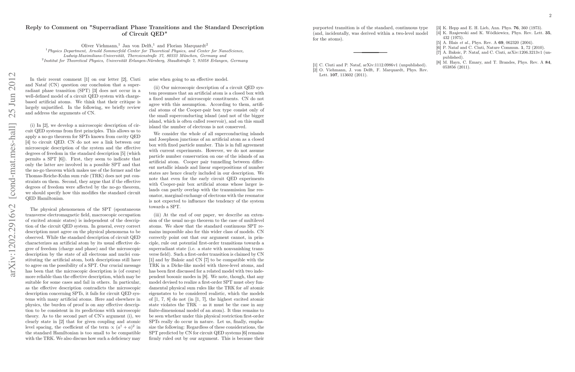 This paper addresses and responds to criticisms raised by C. Ciuti and P. Nataf regarding the authors' previous work on superradiant phase transitions within the context of circuit quantum electrodynamics (QED). The authors clarify and defend their original findings and theoretical framework.