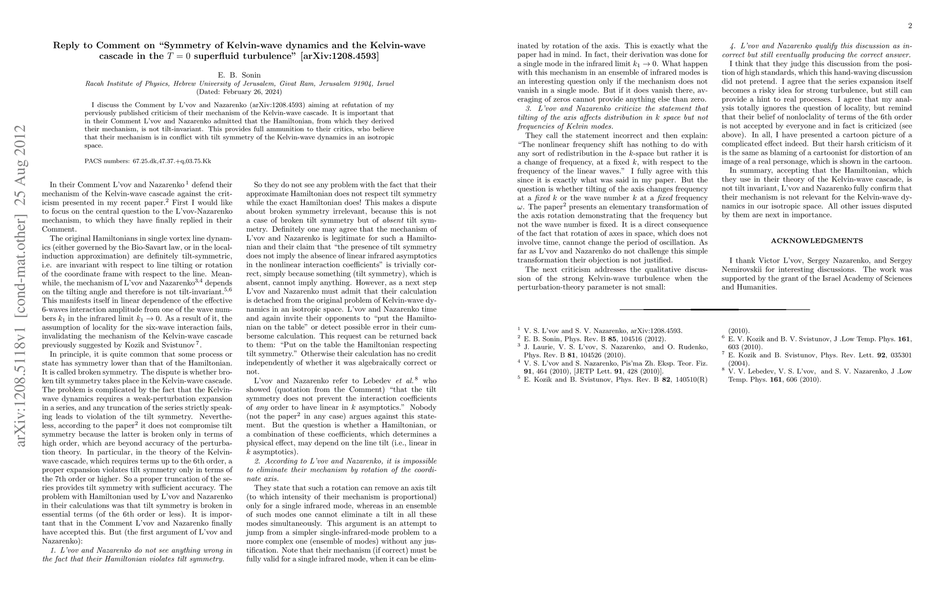I discuss the Comment by L'vov and Nazarenko (arXiv:1208.4593) aiming at refutation of my perviously published criticism of their mechanism of the Kelvin-wave cascade. It is important that in their Comment L'vov and Nazarenko admitted that the Hamiltonian, from which they derived their mechanism, is not tilt-invariant. This provides full ammunition to their critics, who believe that their mechanism is in conflict with tilt symmetry of the Kelvin-wave dynamics in an isotropic space.