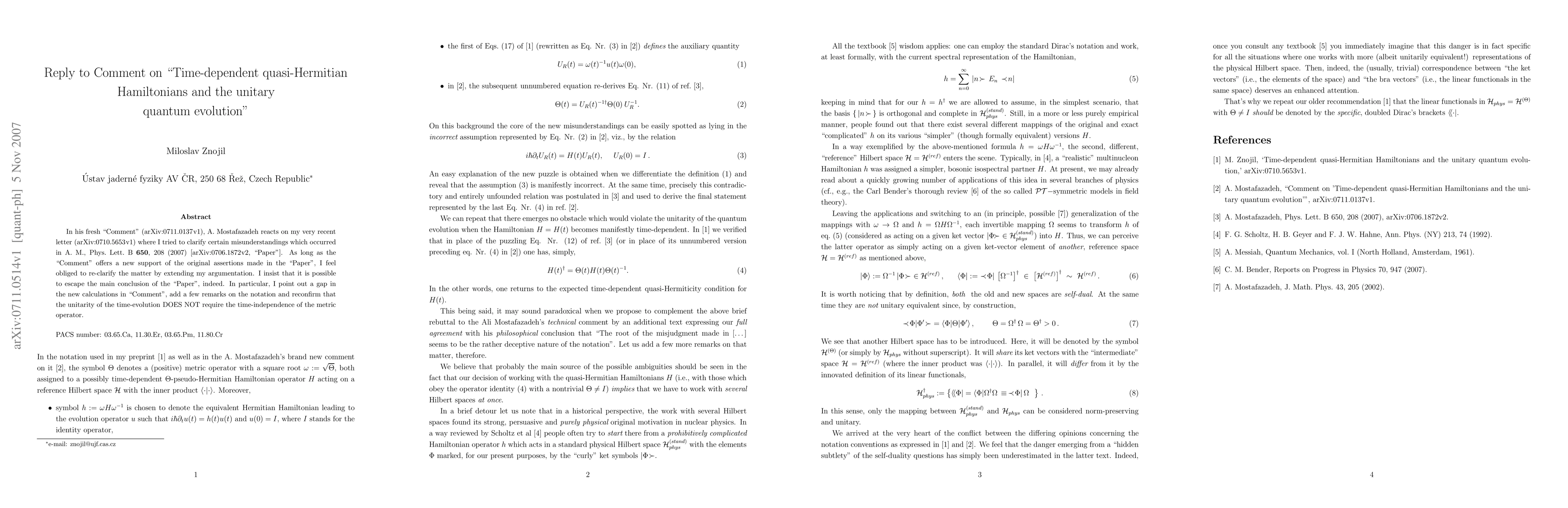 In his fresh "Comment" (arXiv:0711.0137v1), A. Mostafazadeh reacts on my very recent letter (arXiv:0710.5653v1) where I tried to clarify certain misunderstandings which occurred in A. M., Phys. Lett. B \textbf{650}, 208 (2007) [arXiv:0706.1872v2, "Paper"]. As long as the "Comment" offers a new support of the original assertions made in the "Paper", I feel obliged to re-clarify the matter by extending my argumentation. I insist that it is possible to escape the main conclusion of the "Paper", indeed. In particular, I point out a gap in the new calculations in "Comment", add a few remarks on the notation and reconfirm that the unitarity of the time-evolution DOES NOT require the time-independence of the metric operator.
