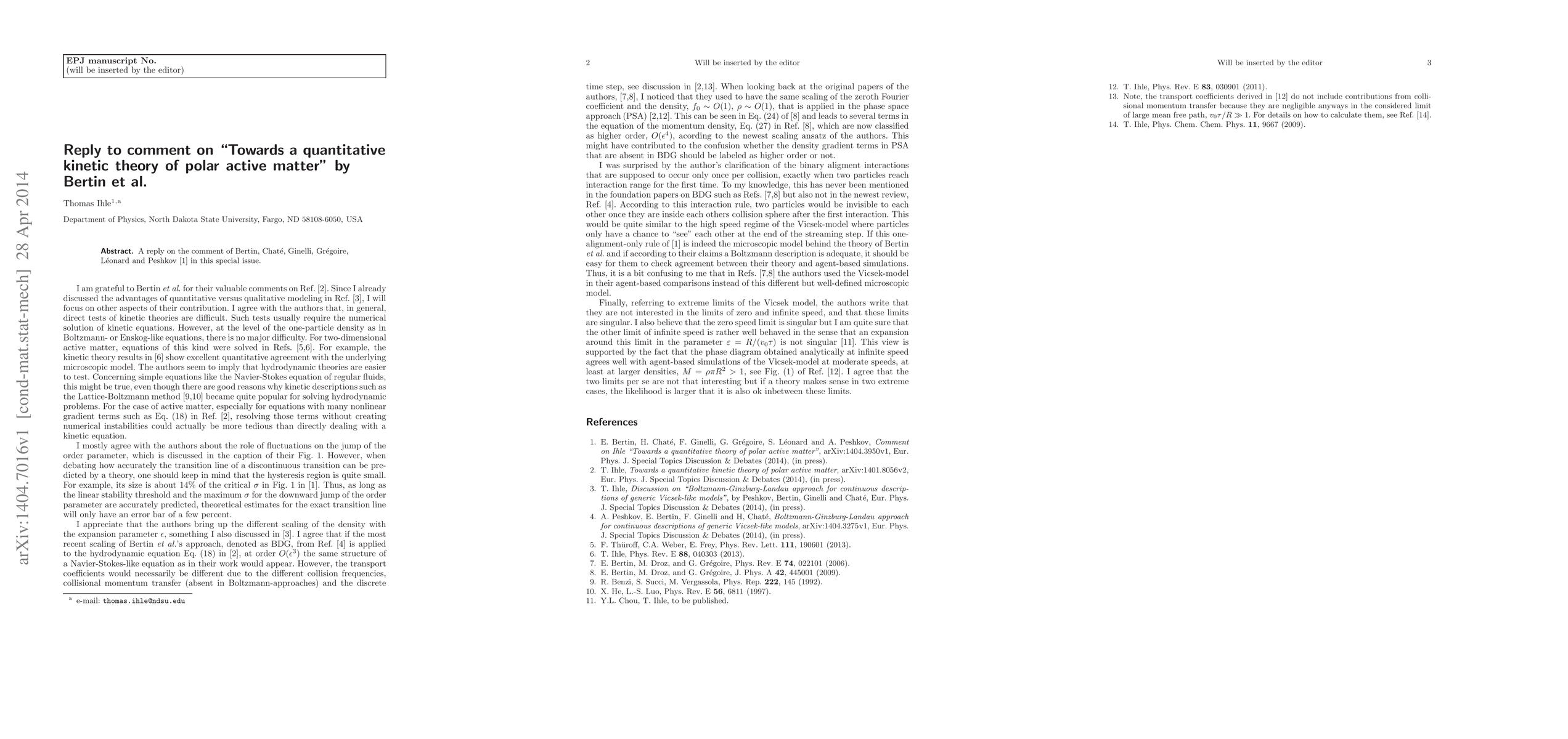 A reply on the comment of Bertin, Chate, Ginelli, Gregoire, Leonard and Peshkov, arxiv:1404.3950v1, in this special issue.