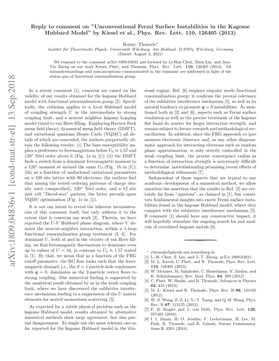 We respond to the comment arXiv:1809.03931 put forward by Li-Han Chen, Zhen Liu, and Jian-Tin Zheng on our work Kiesel, Platt, and Thomale, Phys. Rev. Lett. 110, 126405 (2013). All misunderstandings and misconceptions communicated in the comment are addressed in light of the status quo of functional renormalization group.