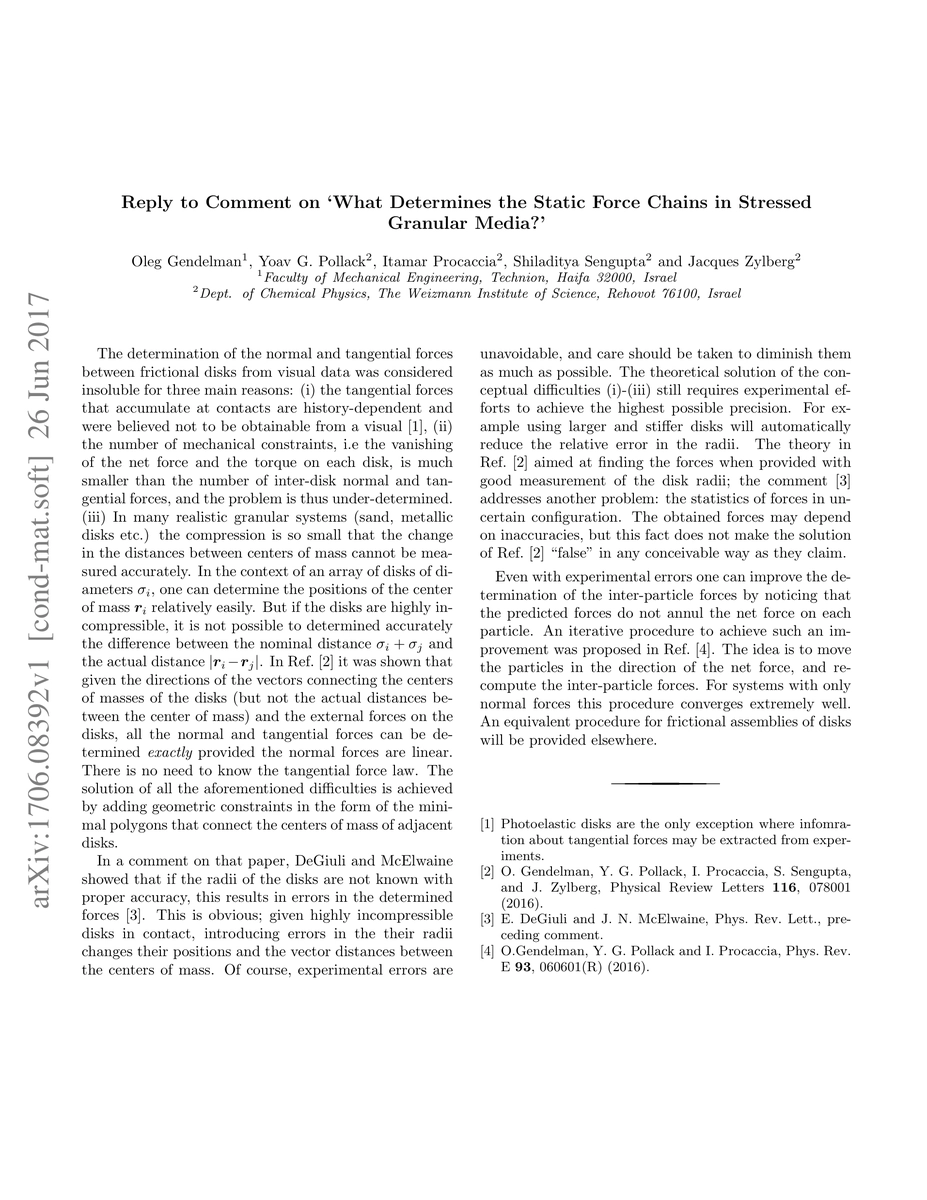 The formalism proposed in Phys. Rev. Lett. 116, 078001 (2016) for determination of the normal and tangential inter-particle forces in frictional disks from visual data was criticized in a comment to that paper. However the theory developed in the original publication is aimed at finding the forces when provided with accurate measurements while the comment addresses a different problem, being the statistics of forces in a configuration with uncertainty of the relevant parameters. We address this difference in perspectives and point out that even with experimental errors one can improve the results using an iterative procedure proposed in Phys. Rev. E. Rapid Communication, 93, 060601(R) (2016).