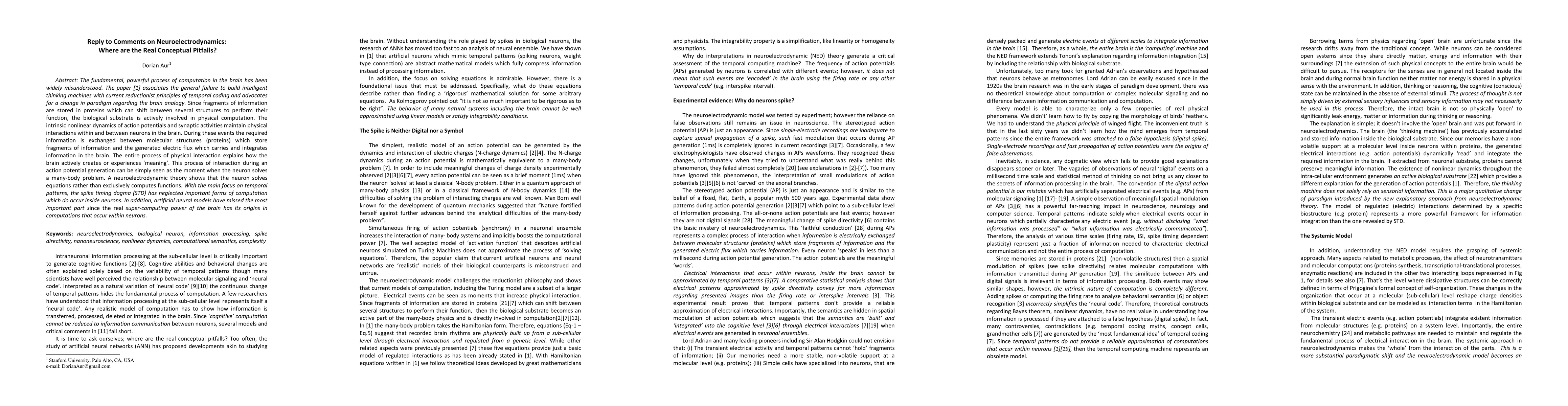 The fundamental, powerful process of computation in the brain has been widely misunderstood. The paper [1] associates the general failure to build intelligent thinking machines with current reductionist principles of temporal coding and advocates for a change in paradigm regarding the brain analogy. Since fragments of information are stored in proteins which can shift between several structures to perform their function, the biological substrate is actively involved in physical computation. The intrinsic nonlinear dynamics of action potentials and synaptic activities maintain physical interactions within and between neurons in the brain. During these events the required information is exchanged between molecular structures (proteins) which store fragments of information and the generated electric flux which carries and integrates information in the brain. The entire process of physical interaction explains how the brain actively creates or experiences meaning. This process of interaction during an action potential generation can be simply seen as the moment when the neuron solves a many-body problem. A neuroelectrodynamic theory shows that the neuron solves equations rather than exclusively computes functions. With the main focus on temporal patterns, the spike timing dogma (STD) has neglected important forms of computation which do occur inside neurons. In addition, artificial neural models have missed the most important part since the real super-computing power of the brain has its origins in computations that occur within neurons.