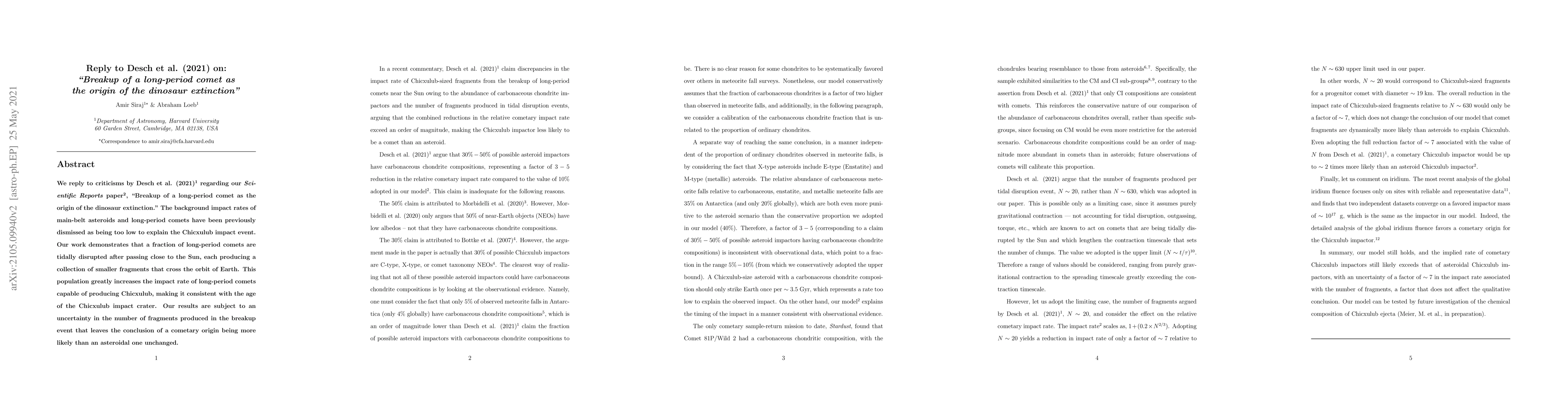 We reply to criticisms by Desch et al. (2021) regarding our Scientific Reports paper, "Breakup of a long-period comet as the origin of the dinosaur extinction." The background impact rates of main-belt asteroids and long-period comets have been previously dismissed as being too low to explain the Chicxulub impact event. Our work demonstrates that a fraction of long-period comets are tidally disrupted after passing close to the Sun, each producing a collection of smaller fragments that cross the orbit of Earth. This population greatly increases the impact rate of long-period comets capable of producing Chicxulub, making it consistent with the age of the Chicxulub impact crater. Our results are subject to an uncertainty in the number of fragments produced in the breakup event that leaves the conclusion of a cometary origin being more likely than an asteroidal one unchanged.