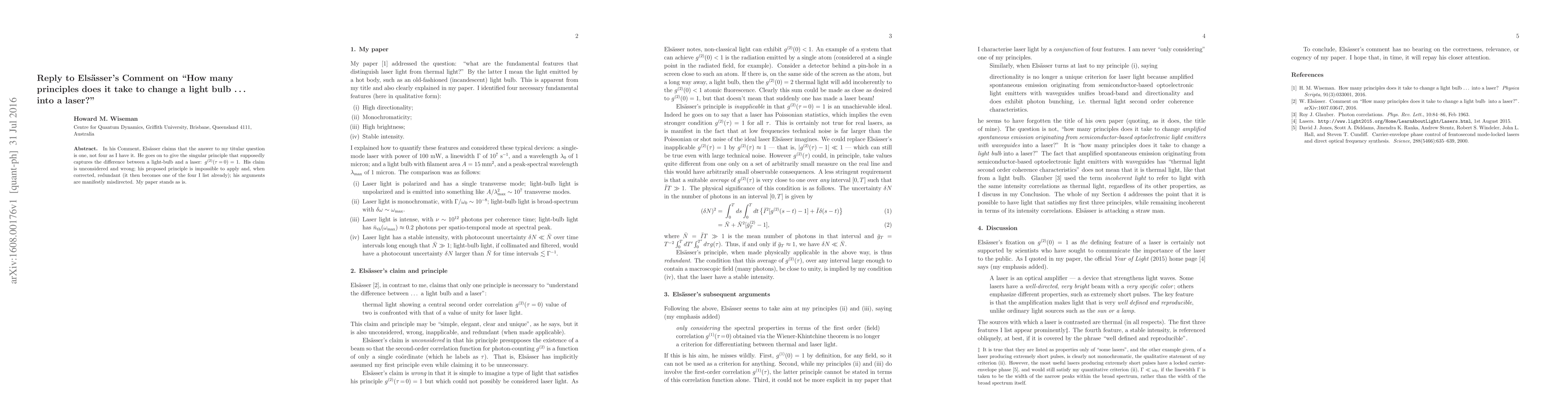 The author refutes Elsässer's claim that only one principle is needed to distinguish a light bulb from a laser, arguing that his proposed principle is incorrect, impractical, and ultimately redundant when properly considered. The original four principles listed in the initial paper remain valid.