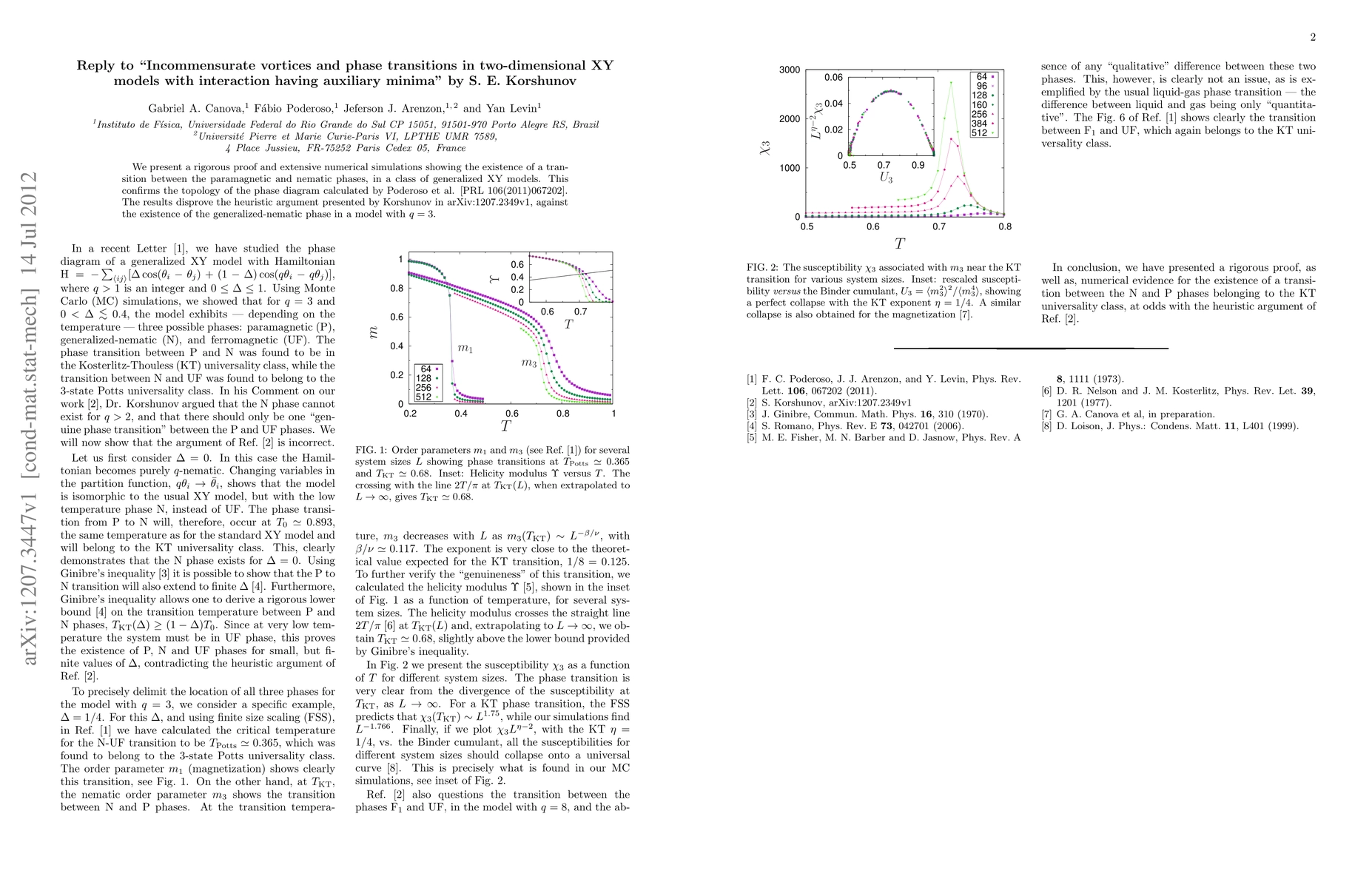 We present a rigorous proof and extensive numerical simulations showing the existence of a transition between the paramagnetic and nematic phases, in a class of generalized XY models. This confirms the topology of the phase diagram calculated by Poderoso et al. [PRL 106(2011)067202]. The results disprove the heuristic argument presented by Korshunov in arXiv:1207.2349v1, against the existence of the generalized-nematic phase in a model with $q=3$.