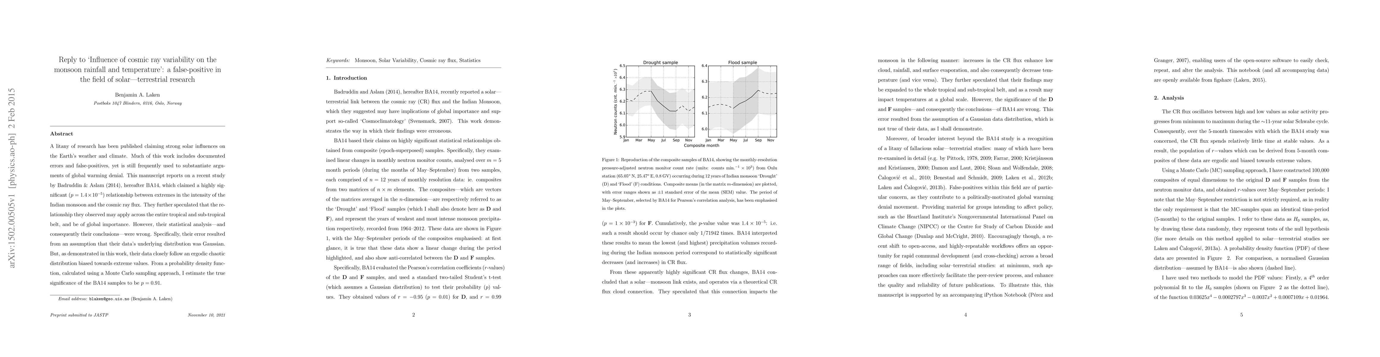 A litany of research has been published claiming strong solar influences on the Earth's weather and climate. Much of this work includes documented errors and false-positives, yet is still frequently used to substantiate arguments of global warming denial. This manuscript reports on a recent study by Badruddin & Aslam (2014), hereafter BA14, which claimed a highly significant ($p=1.4\times10^{-5}$) relationship between extremes in the intensity of the Indian monsoon and the cosmic ray flux. They further speculated that the relationship they observed may apply across the entire tropical and sub-tropical belt, and be of global importance. However, their statistical analysis---and consequently their conclusions---were wrong. Specifically, their error resulted from an assumption that their data's underlying distribution was Gaussian. But, as demonstrated in this work, their data closely follow an ergodic chaotic distribution biased towards extreme values. From a probability density function, calculated using a Monte Carlo sampling approach, I estimate the true significance of the BA14 samples to be $p=0.91$.