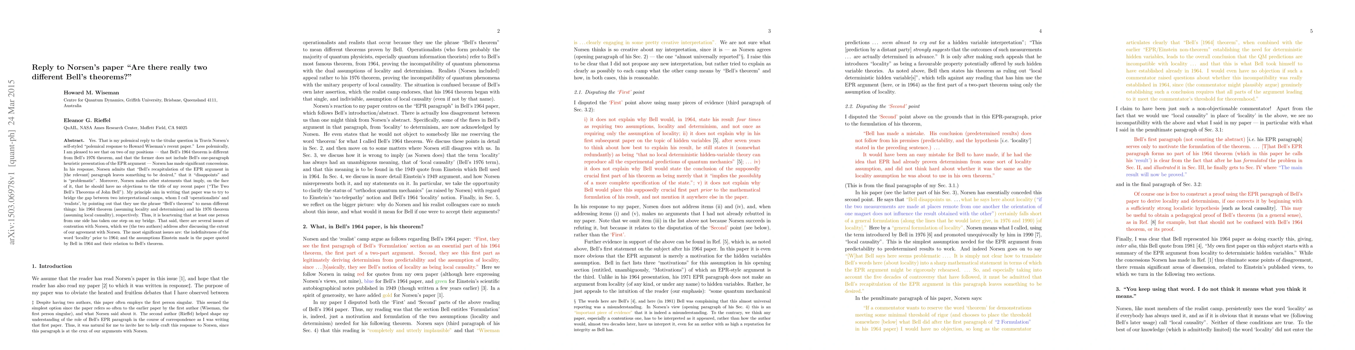 This paper is a response to Travis Norsen's critique of Howard Wiseman's work, agreeing that Bell's 1964 and 1976 theorems differ and that Bell's 1964 presentation of the EPR argument is problematic. The author aims to reconcile differing interpretations of "Bell's theorem" between 'operationalists' and 'realists', highlighting the distinctions between the two theorems. Despite some agreement, the paper also addresses contentious issues like the definition of 'locality' and Einstein's assumptions in Bell's 1964 work.