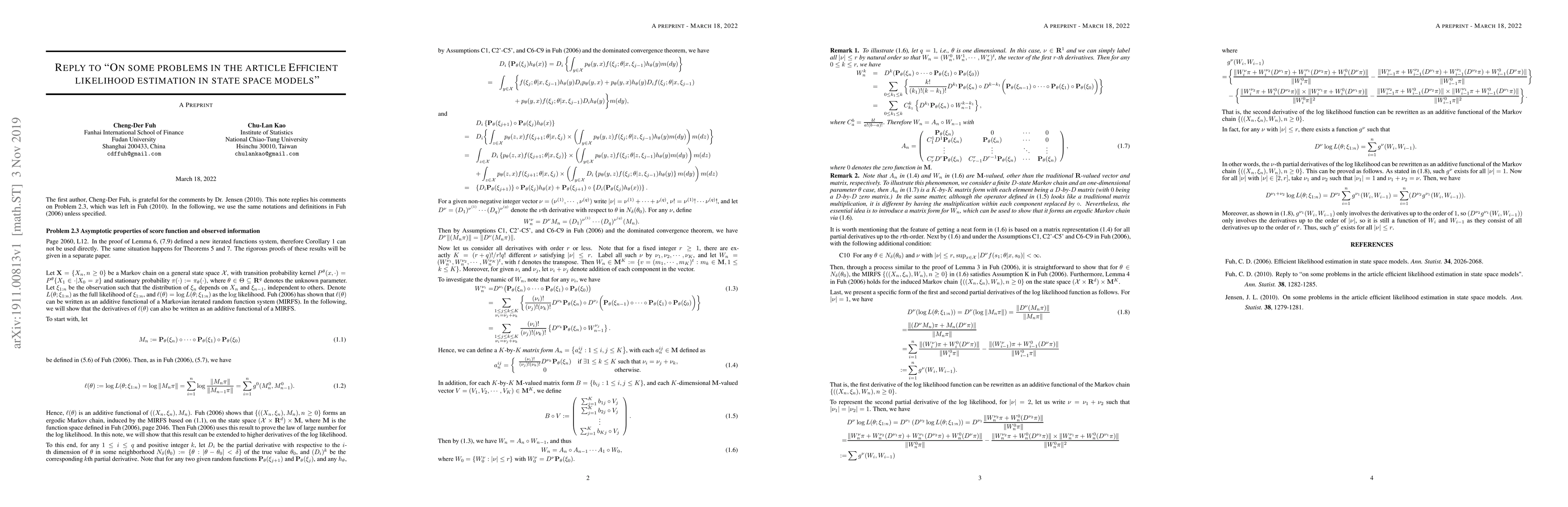 This note addresses Dr. Jensen's (2010) comments on Problem 2.3 in Cheng-Der Fuh's (2006) article on efficient likelihood estimation in state space models, using the same notations and definitions from Fuh's original work unless otherwise specified.