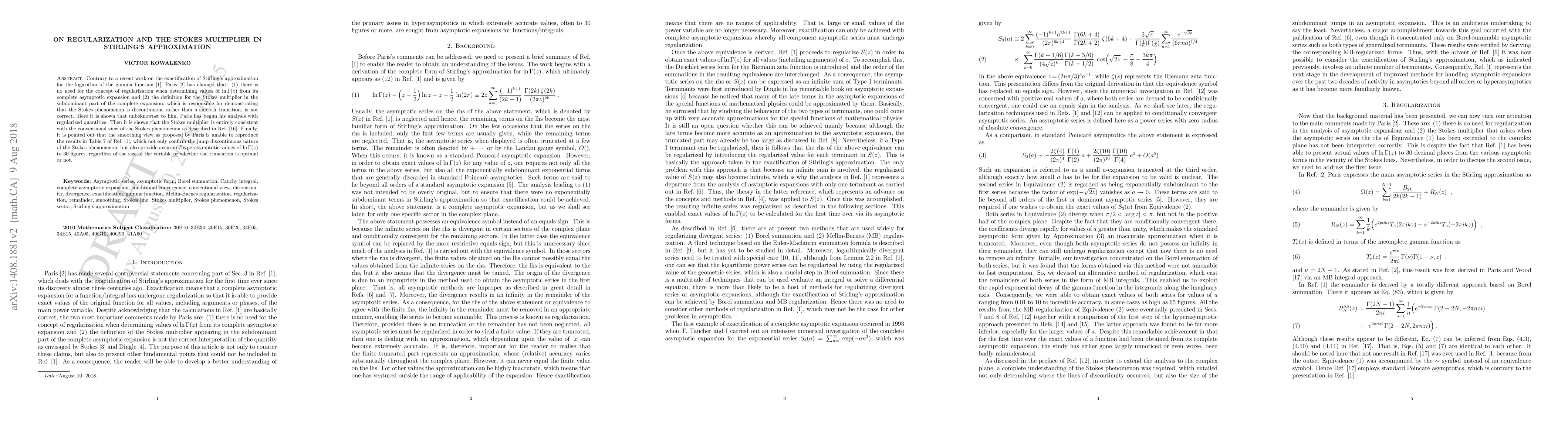 In a recent paper [arXiv:1406.1320] Paris has made several comments concerning the author's recent work on the exactification of Stirling's approximation for the logarithm of the gamma function, $\ln \Gamma(z)$. Despite acknowledging that the calculations in Ref. 2 are basically correct, he claims that there is no need for the concept of regularisation when determining values of $\ln \Gamma(z)$ from its complete asymptotic expansion. Here it is shown that he has already applied the concept at the beginning of the analysis in Ref. 1. Next he claims that the definition used in Ref. 2 for the Stokes multiplier in the subdominant part of a complete expansion, which is responsible for demonstrating that the Stokes phenomenon is discontinuous rather than a smooth transition, is not correct. It is shown that the Stokes multiplier used in Ref. 2 is entirely consistent with Berry's description of the conventional view of the Stokes phenomenon in his famous work where he developed the smoothing view [15]. Furthermore, it is pointed out that Paris has not substantiated the smoothing view by at least reproducing or improving the results in Table 7 of Ref. 2, which not only confirm the jump discontinuous nature of the Stokes phenomenon, but also provide accurate values of $\ln \Gamma(z)$ to 30 figures, regardless of the size of the variable or whether the truncation is optimal or not. Finally, the issue of computational expediency of MB-regularised values over Borel-summed values is discussed since Paris is critical of the Borel-summed forms being used in computations.