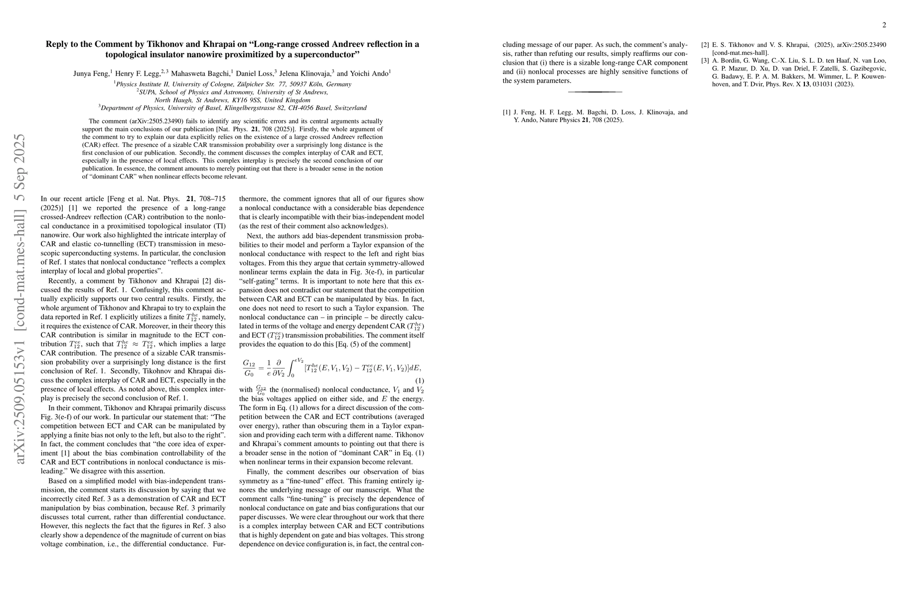 The comment (arXiv:2505.23490) fails to identify any scientific errors and its central arguments actually support the main conclusions of our publication [Nat. Phys. 21, 708 (2025)]. Firstly, the whole argument of the comment to try to explain our data explicitly relies on the existence of a large crossed Andreev reflection (CAR) effect. The presence of a sizable CAR transmission probability over a surprisingly long distance is the first conclusion of our publication. Secondly, the comment discusses the complex interplay of CAR and elastic co-tunneling, especially in the presence of local effects. This complex interplay is precisely the second conclusion of our publication. In essence, the comment amounts to merely pointing out that there is a broader sense in the notion of "dominant CAR" when nonlinear effects become relevant.