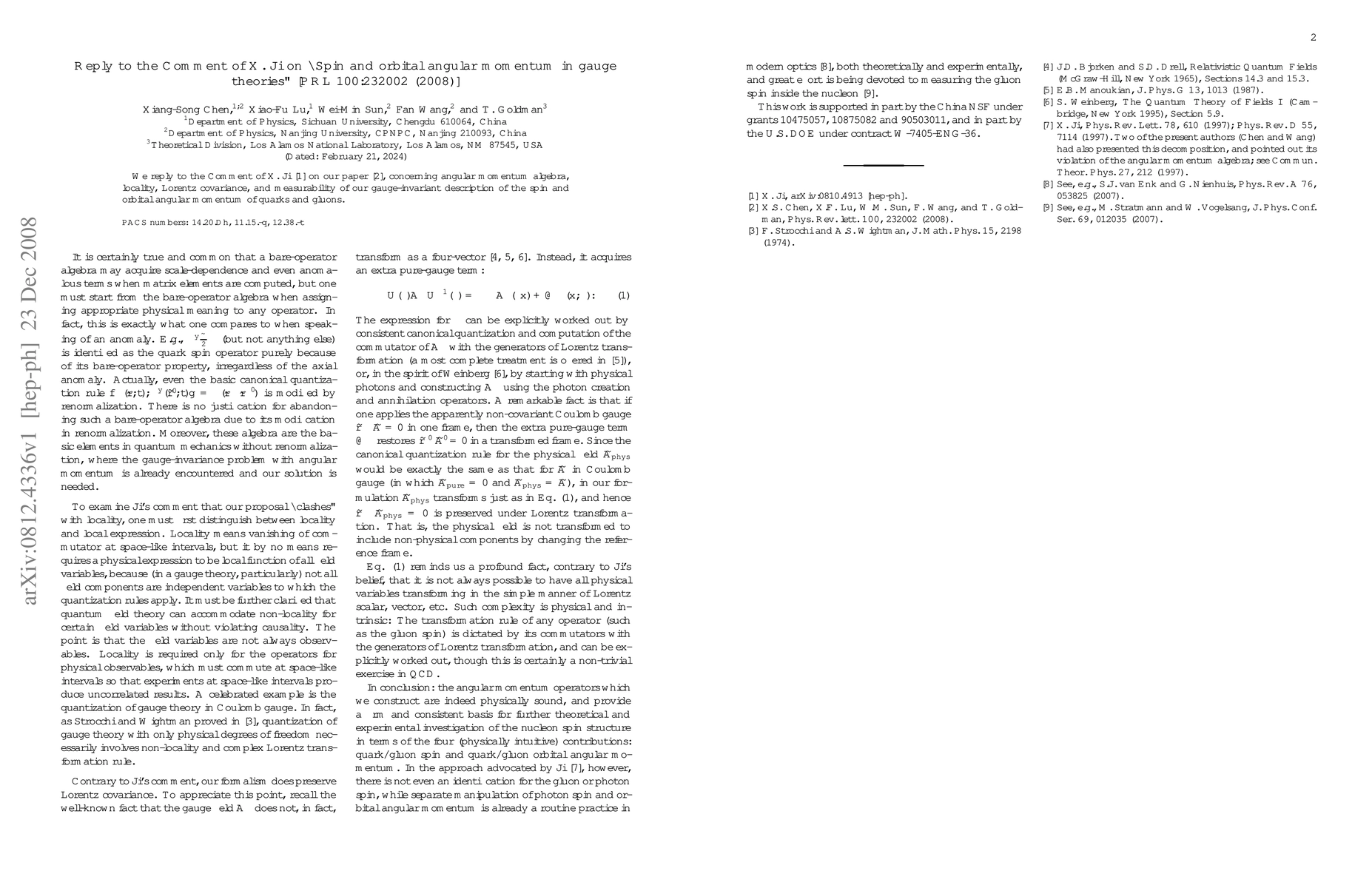 This paper addresses and responds to comments by X. Ji regarding the gauge-invariant description of spin and orbital angular momentum in gauge theories, focusing on issues of angular momentum algebra, locality, Lorentz covariance, and measurability.