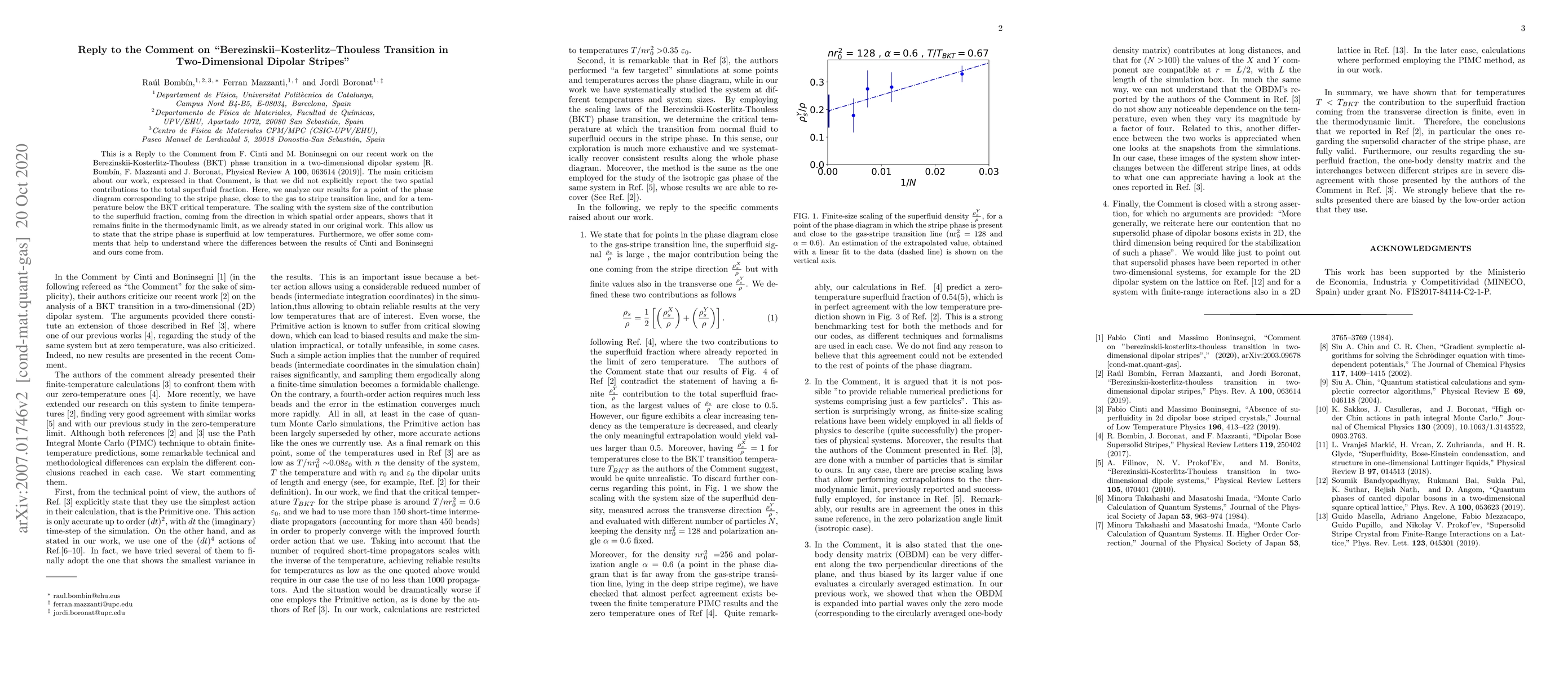 This paper addresses criticisms regarding the original work on the Berezinskii-Kosterlitz-Thouless transition in two-dimensional dipolar stripes, clarifying the superfluid fraction's spatial contributions. It confirms the stripe phase's superfluidity at low temperatures and discusses discrepancies with other studies.