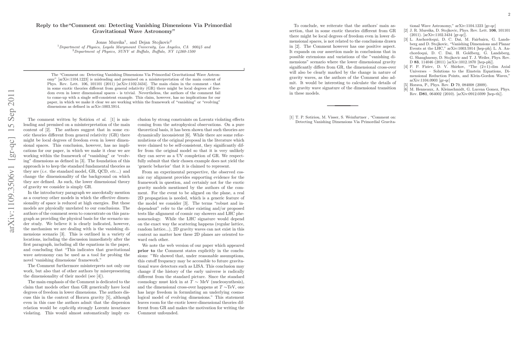 The "Comment on: Detecting Vanishing Dimensions Via Primordial Gravitational Wave Astronomy" [arXiv:1104.1223] is misleading and premised on a misinterpretation of the main content of Phys. Rev. Lett. 106, 101101 (2011) [arXiv:1102.3434]. The main claim in the comment - that in some exotic theories different from general relativity (GR) there might be local degrees of freedom even in lower dimensional spaces - is trivial. Nevertheless, the authors of the Comment fail to come-up with a single self-consistent example. This claim, however, has no implications for our paper, in which we make it clear we are working within the framework of "vanishing" or "evolving" dimensions as defined in arXiv:1003.5914.
