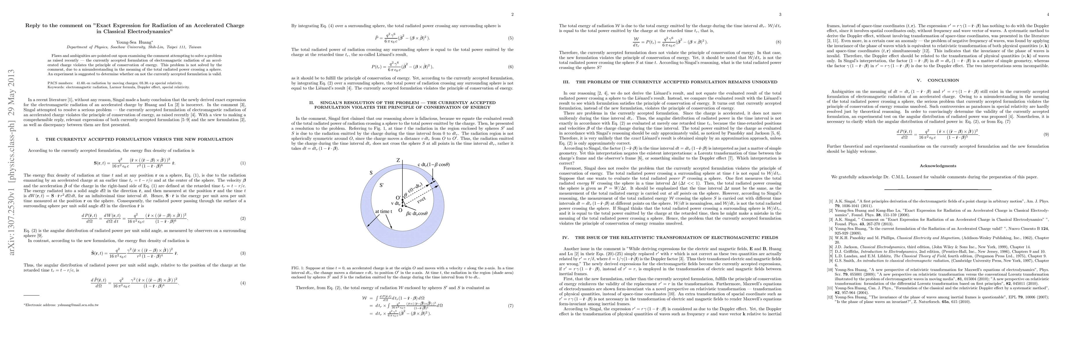 Flaws and ambiguities are pointed out upon examining the comment attempting to solve a problem as raised recently --- the currently accepted formulation of electromagnetic radiation of an accelerated charge violates the principle of conservation of energy. This problem is not solved by the comment, due to a misunderstanding in the meaning of the total radiated power crossing a sphere. An experiment is suggested to determine whether on not the currently accepted formulation is valid.