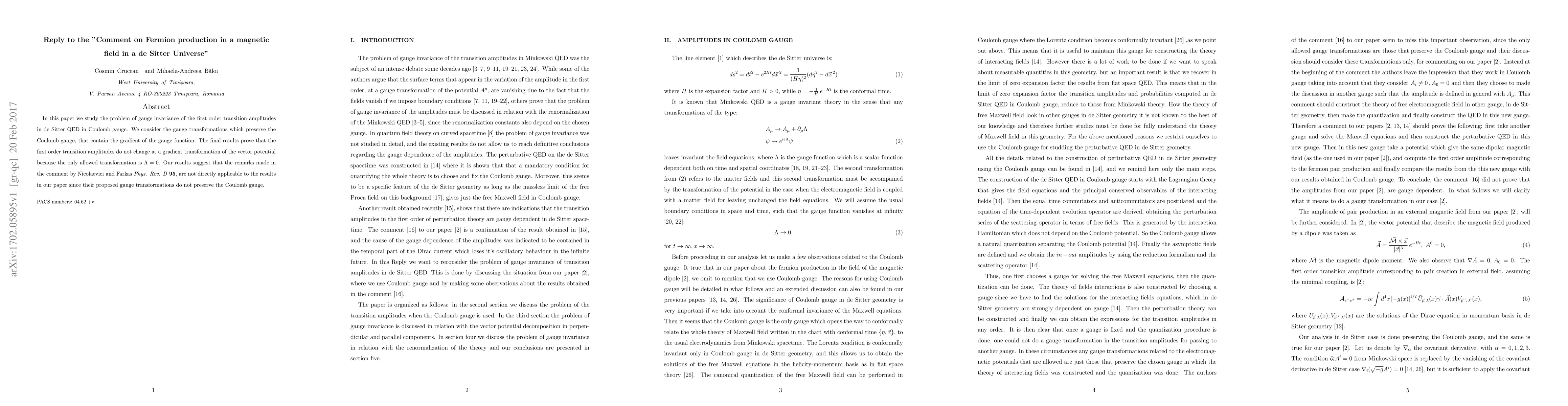 In this paper we study the problem of gauge invariance of the first order transition amplitudes in de Sitter QED in Coulomb gauge. We consider the gauge transformations which preserve the Coulomb gauge, that contain the gradient of the gauge function. The final results prove that the first order transition amplitudes do not change at a gradient transformation of the vector potential because the only allowed transformation is $\Lambda=0$. Our results suggest that the remarks made in the comment by Nicolaevici and Farkas {\em Phys. Rev. D} \textbf{95}, are not directly applicable to the results in our paper since their proposed gauge transformations do not preserve the Coulomb gauge.