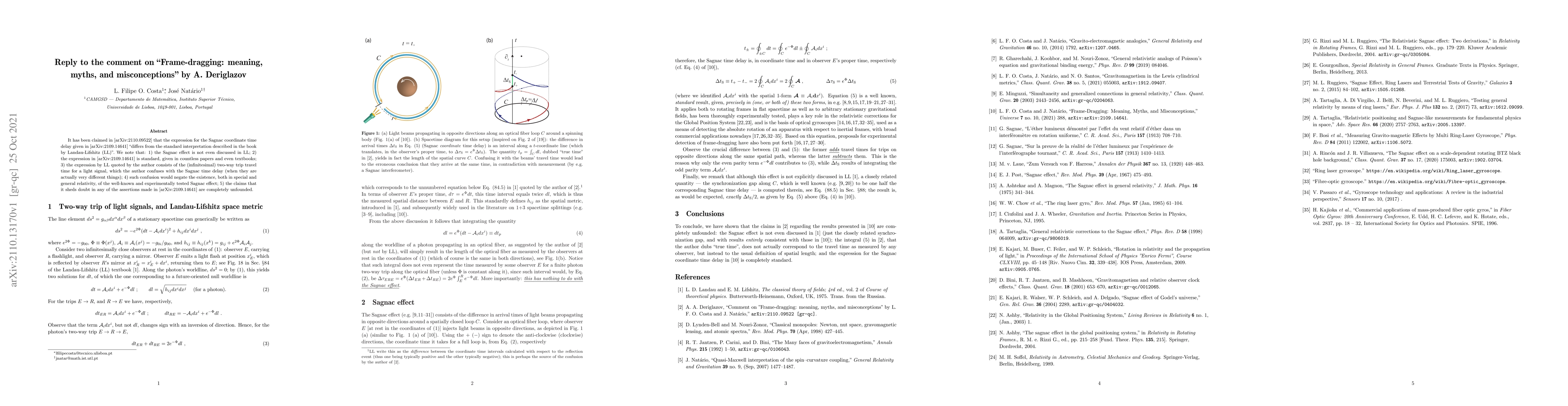 It has been claimed in [arXiv:2110.09522] that the expression for the Sagnac coordinate time delay given in [arXiv:2109.14641] "differs from the standard interpretation described in the book by Landau-Lifshitz (LL)". We note that: 1) the Sagnac effect is not even discussed in LL; 2) the expression in [arXiv:2109.14641] is standard, given in countless papers and even textbooks; 3) the expression by LL quoted by the author consists of the (infinitesimal) two-way trip travel time for a light signal, which the author confuses with the Sagnac time delay (when they are actually very different things); 4) such confusion would negate the existence, both in special and general relativity, of the well-known and experimentally tested Sagnac effect; 5) the claims that it sheds doubt in any of the assertions made in [arXiv:2109.14641] are completely unfounded.